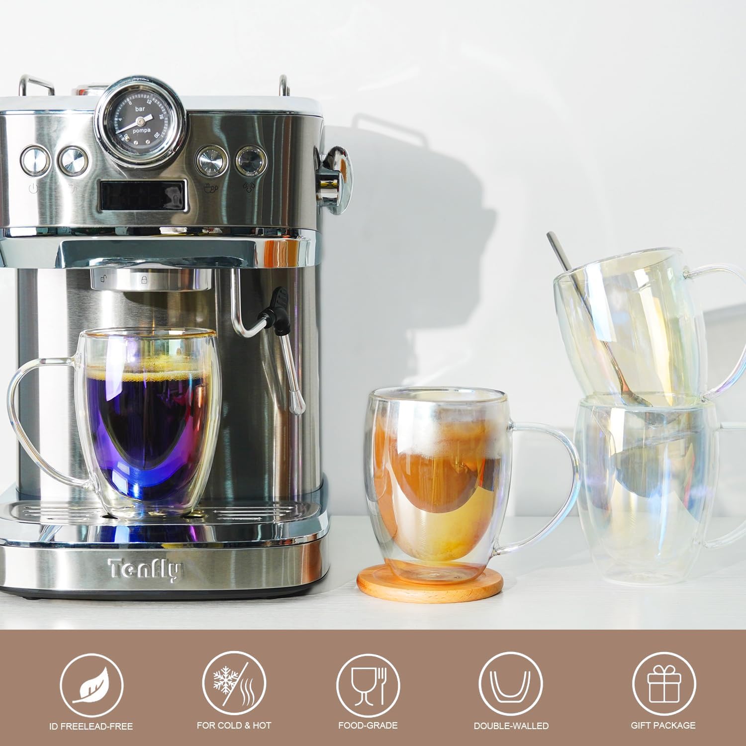 - DOUBLE WALLED INSULATED DESIGN: The glass mug is double-walled, so even if you put something cold or warm in it, the temperature won't be transmitted, and it won't condense. Espresso cup with handle design, comfortable to hold in your hand, enjoy hot and iced drinks, with innovative insulated double-wall design and modern appearance.