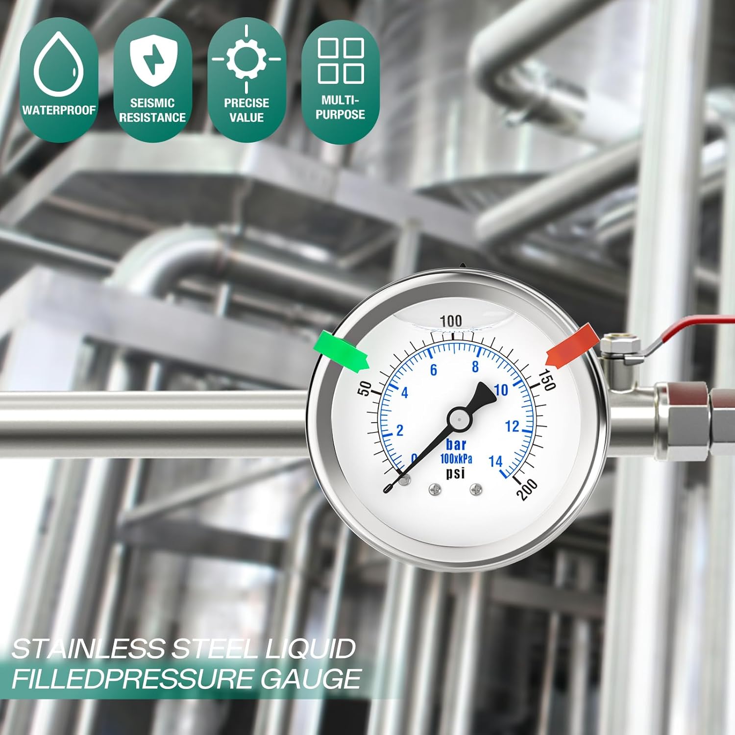 0-200PSI Stainless Steel Liquid Filled Pressure Gauge, 2.5" Dial Size, 1/4" NPT 316 Stainless Steel Joint, Back Mount, for Tube, Water Pump, Gas, Liquid (with Range Mark Pointer)