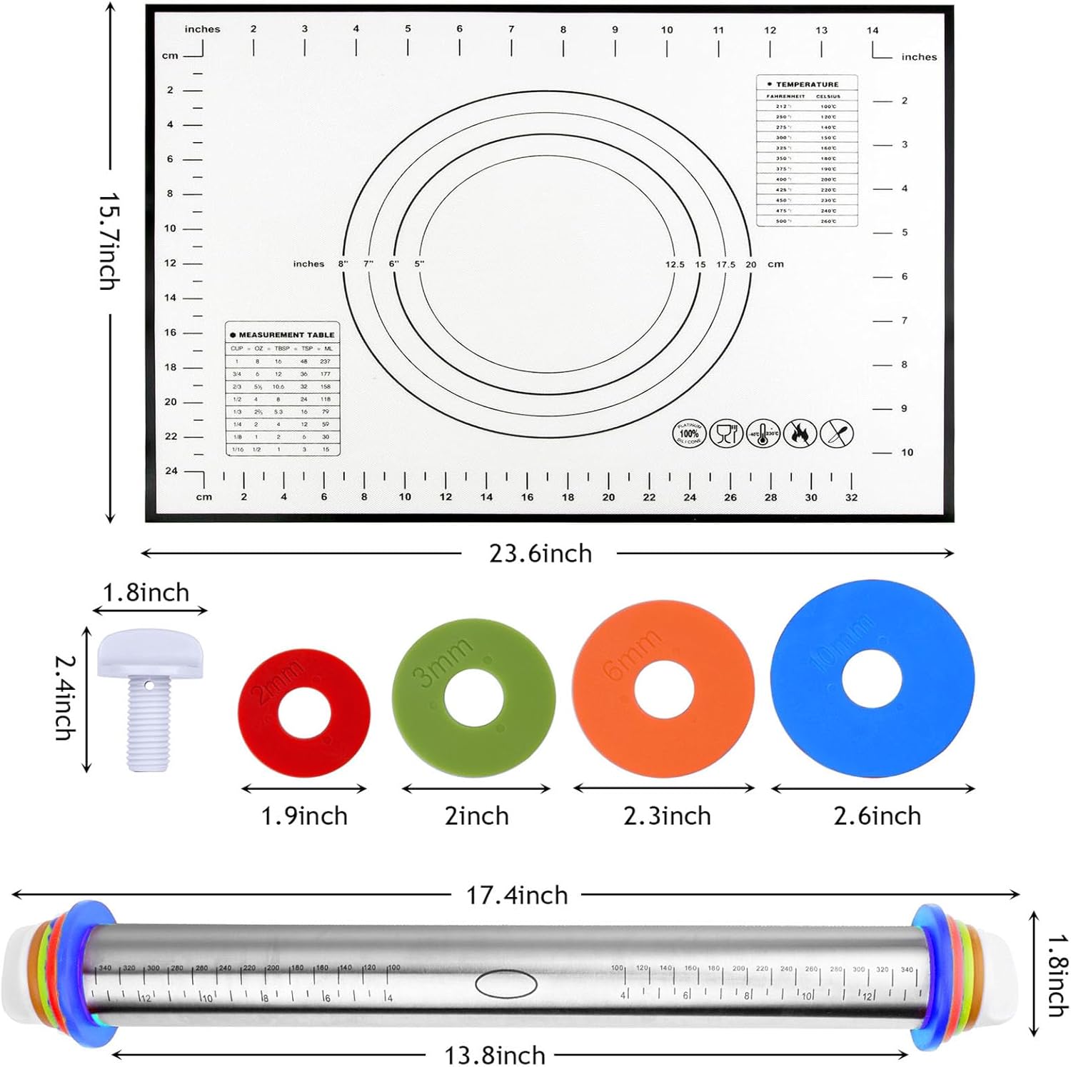 - 1.20 Pcs Baking Tool Food-grad COMPLETE BASIC TOOLS INCLUDED FOR BAKING: Our AMREMSU Rolling Pin Set meets the Food-Grade standards, made of high quality food-grade 304 Stainless Steel, silicone and plastic, including an adjustable thick rolling pin ,a silicone baking pastry mat,a stainless steel scraper ,Plastic spatula, 3 cookie molds and 3 cake cups ,No matter you are a professional baker or beginner, our rolling pin set will make you more comfortable and like cooking,save a lot of money!