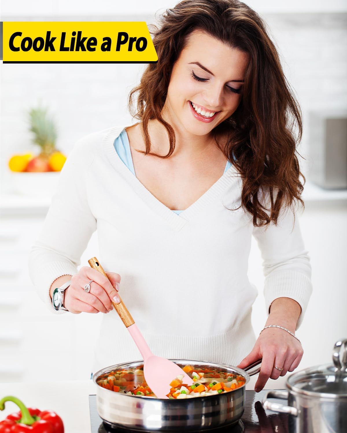Pack of 4 Silicone Cooking Utensils Set, Non Stick Solid Spatulas and Heat Resistant Slotted Spoons with Wooden Handle, Ideal Wood Kitchen Utensils Set for Frying,Serving,Turning,Stirring (PINK)