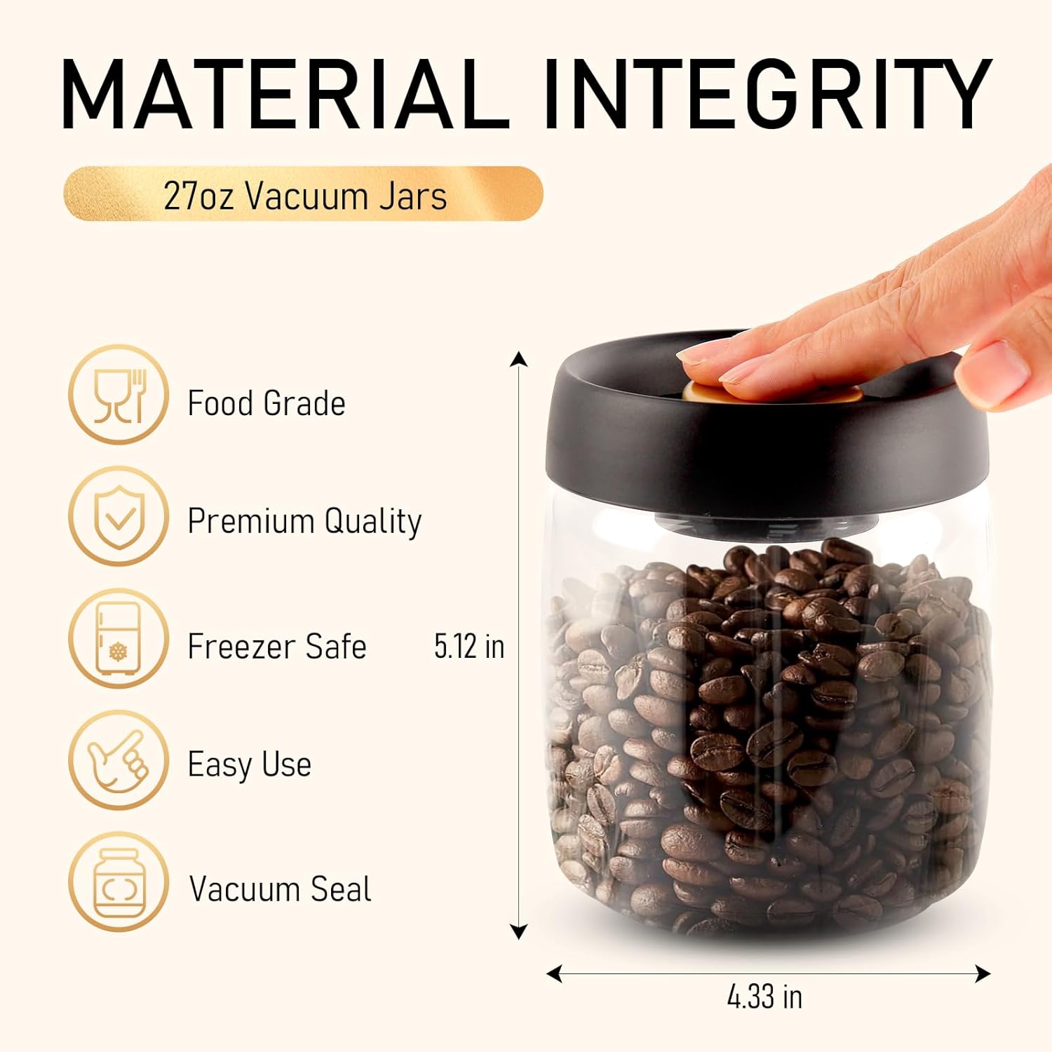 - Kitchen Essentials Jars: Don't have a vacuum sealer? Don't worry! We offer you an all-in-one vacuum-sealed mason jars that can be used to both store food and use it to evacuate air from the jar. Our jar has a fashionable appearance, easy operation and 27oz/800ml large capacity. By pressing the big button, you can vaccum the canister to make sure the best sotrage. Durable vacuum lids can be used repeatedly, making this an eco-friendly and cost-effective food storage solution