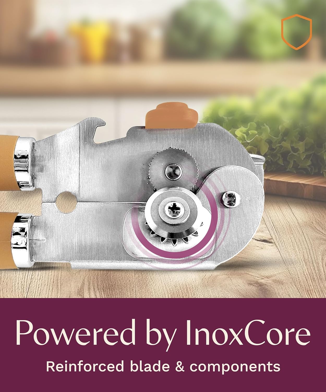 - 【INOXCORE Rust-Proof Stainless Steel Can Opener & Precision Gears with Ultra-Sharp Blade for Smooth-Edge Cuts】 Constructed with reinforced INOXCORE stainless steel components, rust-proof finish, and precision-aligned gears, this premium kitchen tool houses a razor-sharp, high-carbon blade for smooth-edge, jag-free cuts every time. Its solid weight and brushed exterior delivers lasting sharpness and a premium feel.