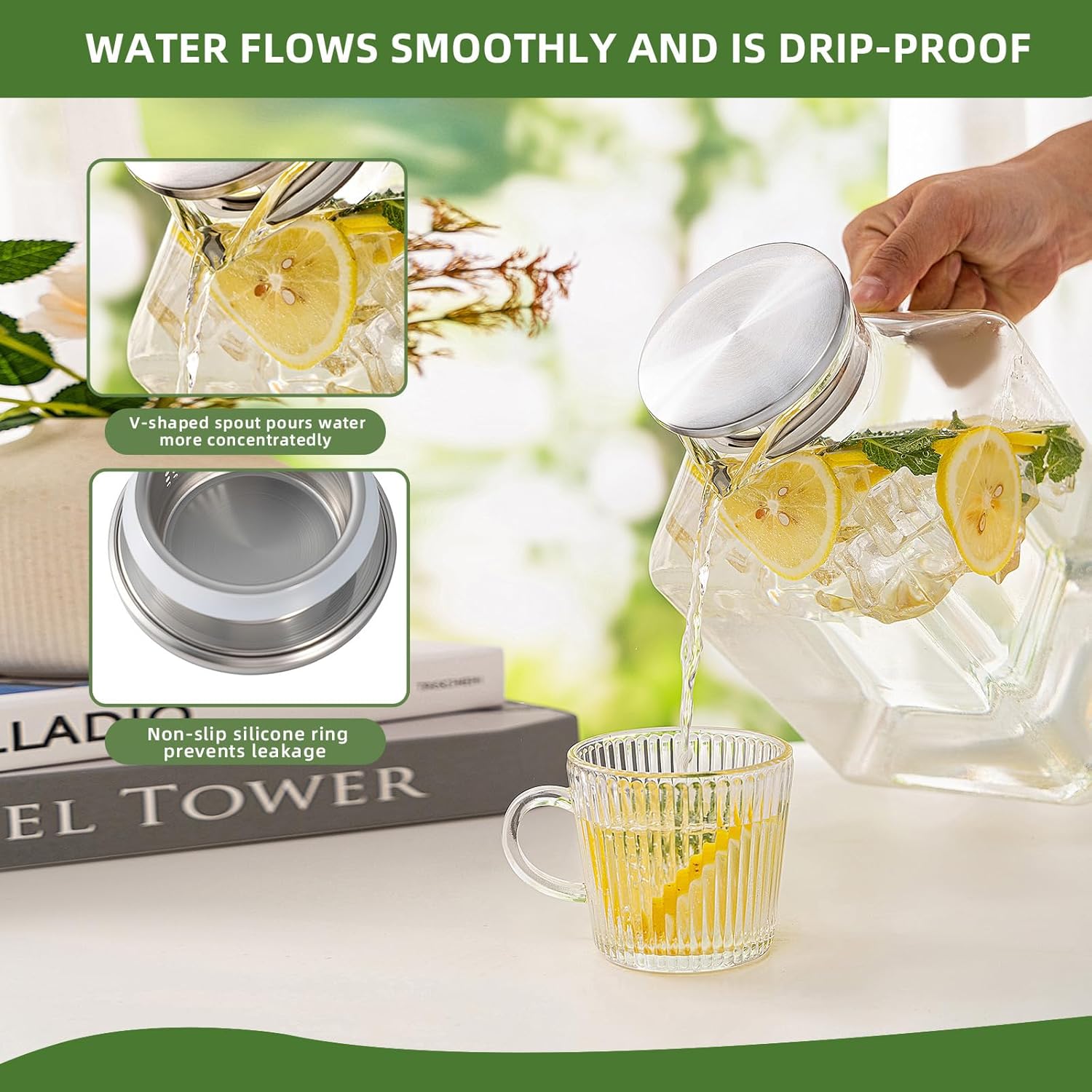 - [Safe and Sturdy Glass Material]: Our pitcher is crafted from premium high-grade borosilicate glass, ensuring it's 100% free of lead, heavy metals, and toxins. With a sturdy 4mm thickness, our pitchers are built to last, ensuring enduring durability.