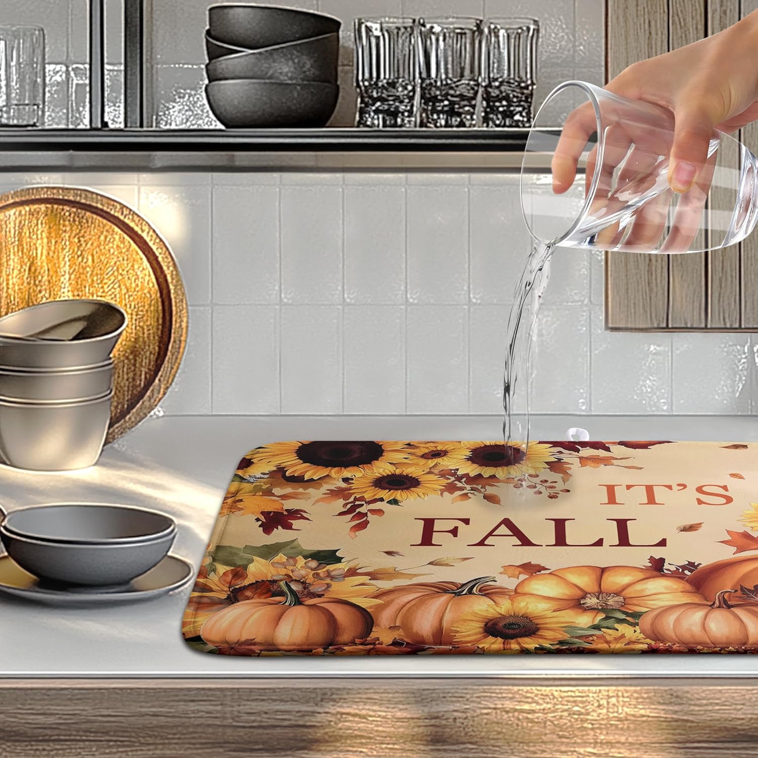 - [Material]: The surface of this Fall Sunflower Orange Pumpkins kitchen drying mat is made of absorbent microfiber and the middle is made of composite sponge. Fall Pumpkin Maple Leaves Large microfiber dish drying mat can be easily rolled up and folded for storage or hanging.