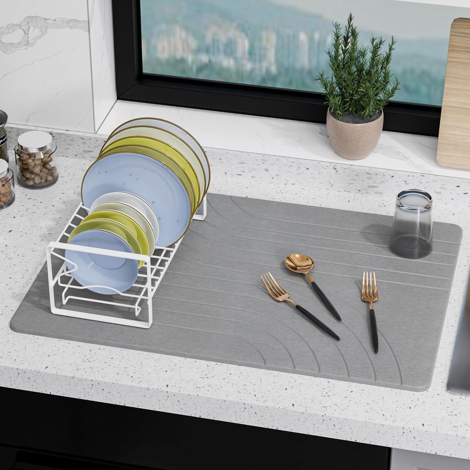- [NATURAL DIATOMACEOUS EARTH DRYING MAT]:This stone dish drying mat is made of natural diatomaceous earth in the material, which is natural and environmentally friendly, non-toxic and safe. The stone drying mat lasts longer than traditional drying mats and ensures that your kitchen countertops are drier and tidier while in use.