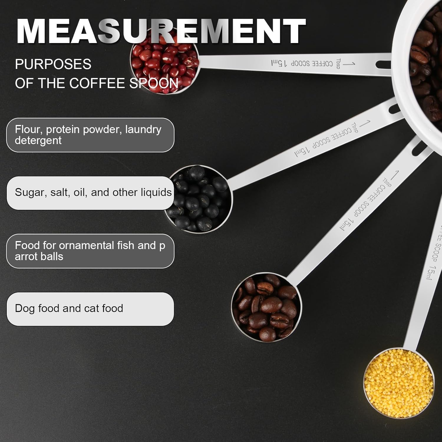 - KITCHEN MULTIFUNCTIONAL MEASURING SPOONS: Our coffee scoops for ground coffee have a wide range of applications, not only suitable for coffee, but also perfect for tea, protein powder, flour, sugar, salt, fiber powder, and liquid flavorings. A perfect addition to your kitchen gadgets.