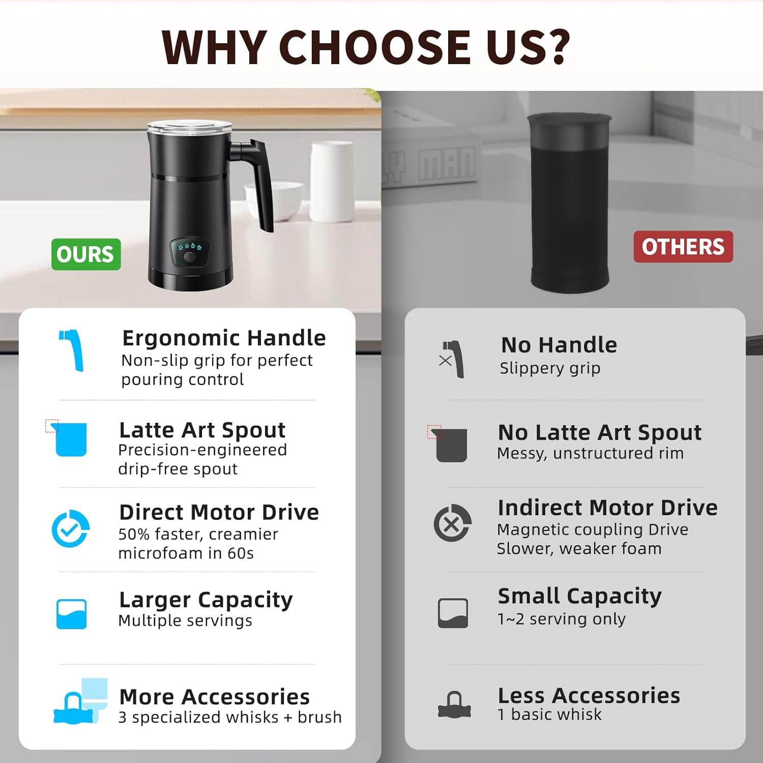 - 𝐋𝐢𝐠𝐡𝐭𝐧𝐢𝐧𝐠-𝐅𝐚𝐬𝐭 & 𝐒𝐮𝐩𝐞𝐫𝐢𝐨𝐫 𝐅𝐫𝐨𝐭𝐡𝐢𝐧𝐠 – Our motor-direct-drive whisk (vs. magnetic-coupling motors) delivers 30% finer bubbles. In cold foam mode achieve barista-grade microfoam in 1 minute, 50% faster, cutting time in half while creating silkier, denser foam for professional texture.