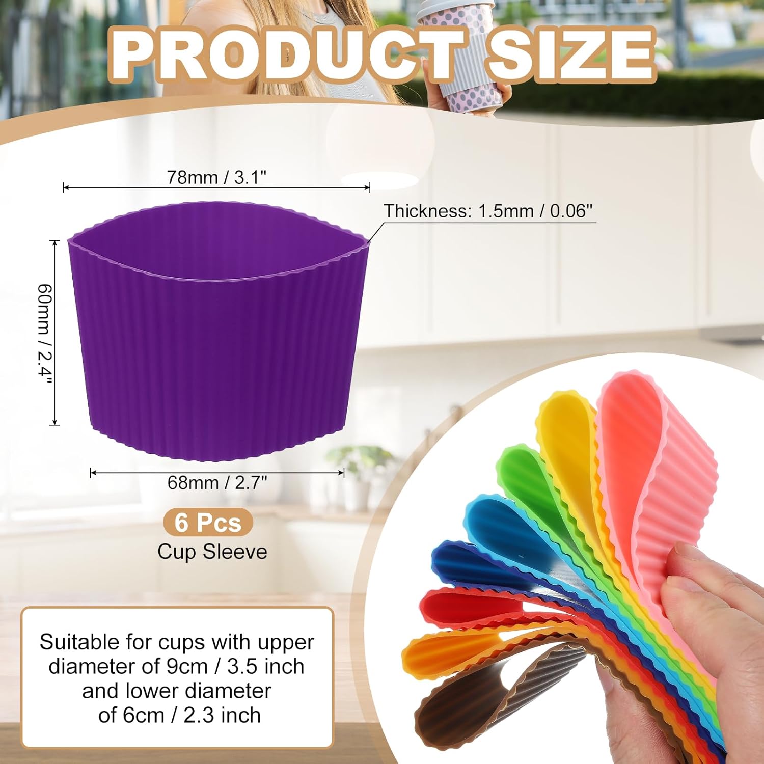 - Specification: Color: Purple; Material: Silicone; Style: Tapered Stripes; High: 60mm / 2.4 inch; Upper Diameter: 78mm / 3.1 inch; Lower Diameter: 68mm / 2.7 inch; Thickness: 1.5mm / 0.06 inch; Applicable Cup Upper Diameter: 9cm / 3.5 inch; Applicable Cup Lower Diameter: 6cm / 2.4 inch; Package Contents: 6 x Cup Sleeve