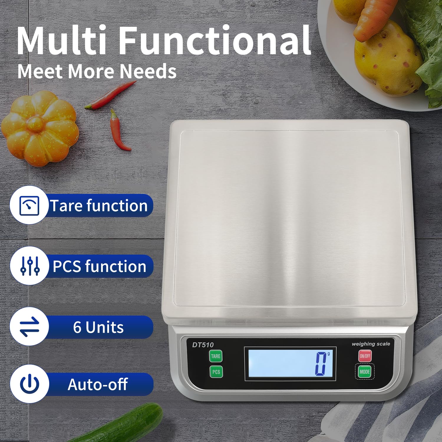- MULTIFUNCTION COMMERCIAL KITCHEN SCALE: Easy Tare with a simple press of the tare button, you can subtract the weight of plates or containers, ensuring precise ingredient measurements. The PCS function enables small identical items counting such as pins, beads, screws.