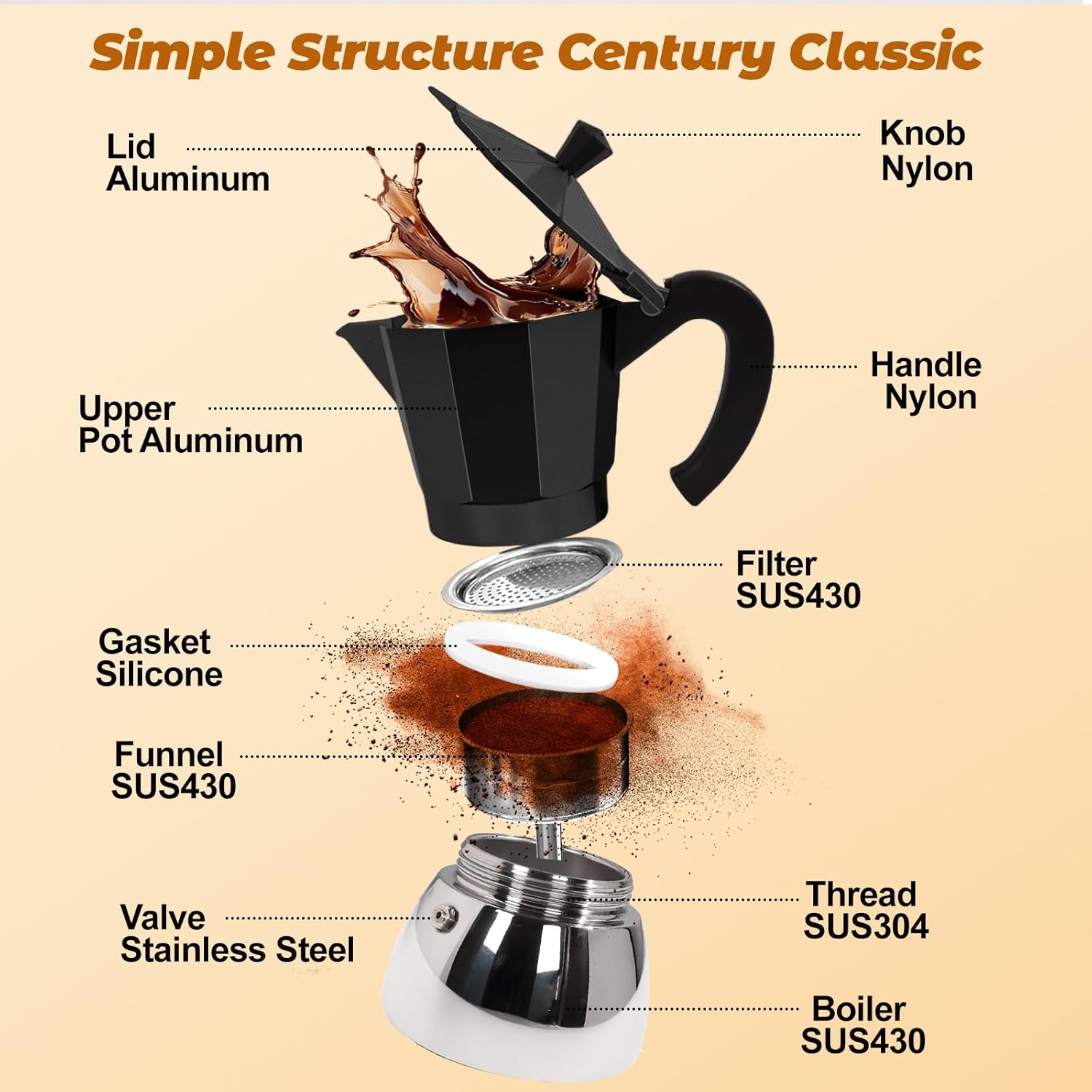 No Coating 6 Cup Aluminum and Stainless Steel Moka Pot Stovetop Espresso Maker Italian Coffee Machine 350ml 11.84oz Suitable for Gas Induction Stovetop Greca Coffee Maker Percolator Black