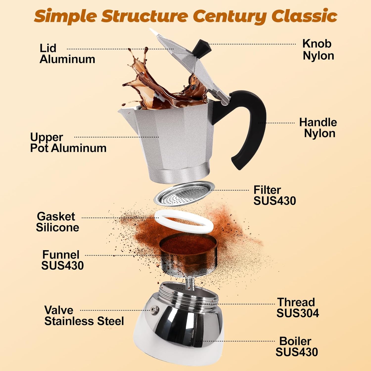 No Coating 6 Cup Aluminum and Stainless Steel Moka Pot Stovetop Espresso Maker Italian Coffee Machine 350ml 11.84oz Suitable for Gas Induction Stovetop Greca Coffee Maker Percolator Silver