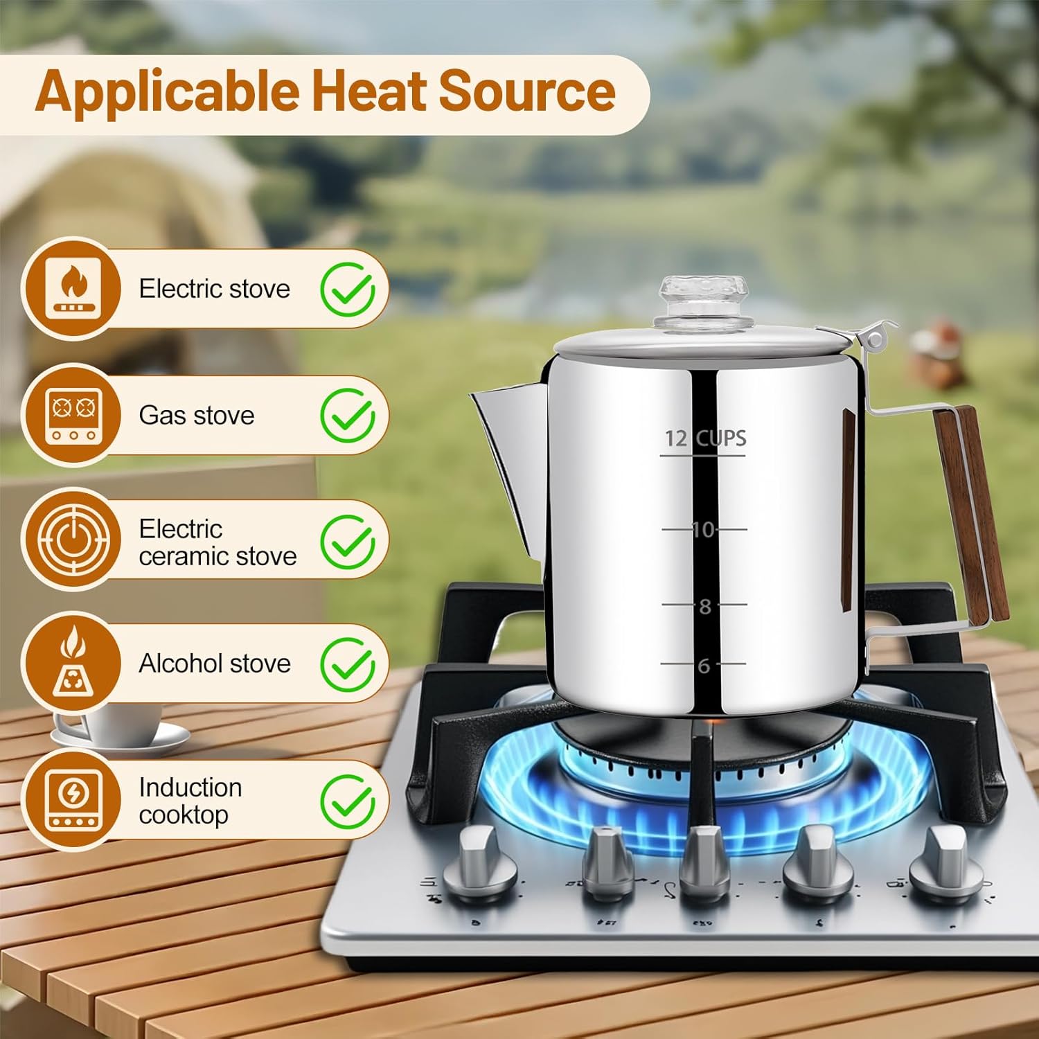 No Coating 12 Cup Percolator Coffee Pot 304 Stainless Steel Moka Pot Stovetop Espresso Maker Italian Greca Cuban Machine 2200ml 74.4oz Suitable for Gas Induction Stovetop Camping Kettle