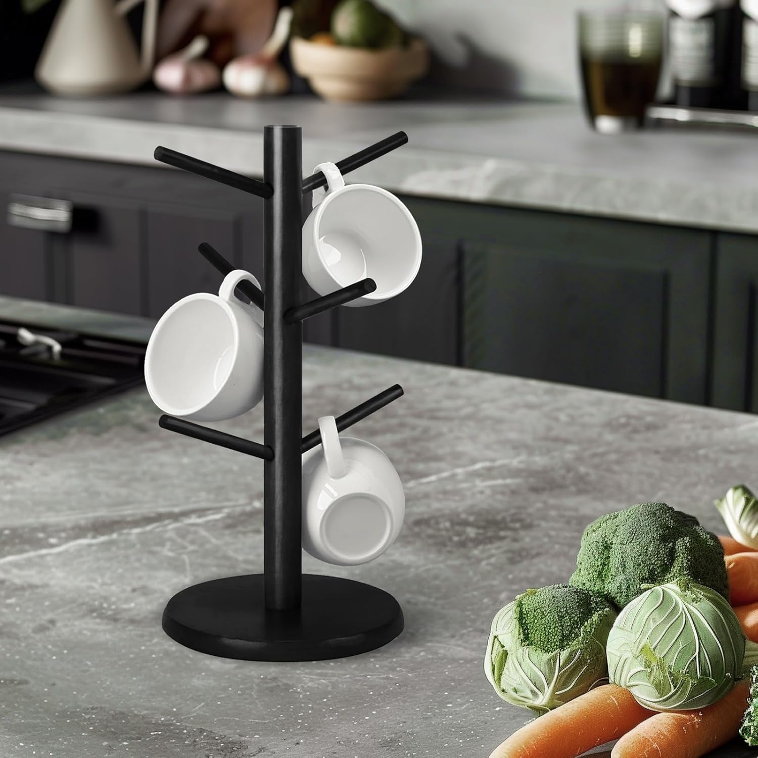 Wooden Mug Holder Tree, Coffee Cup Holder, Mug Organizer with 6 Hooks (Black)