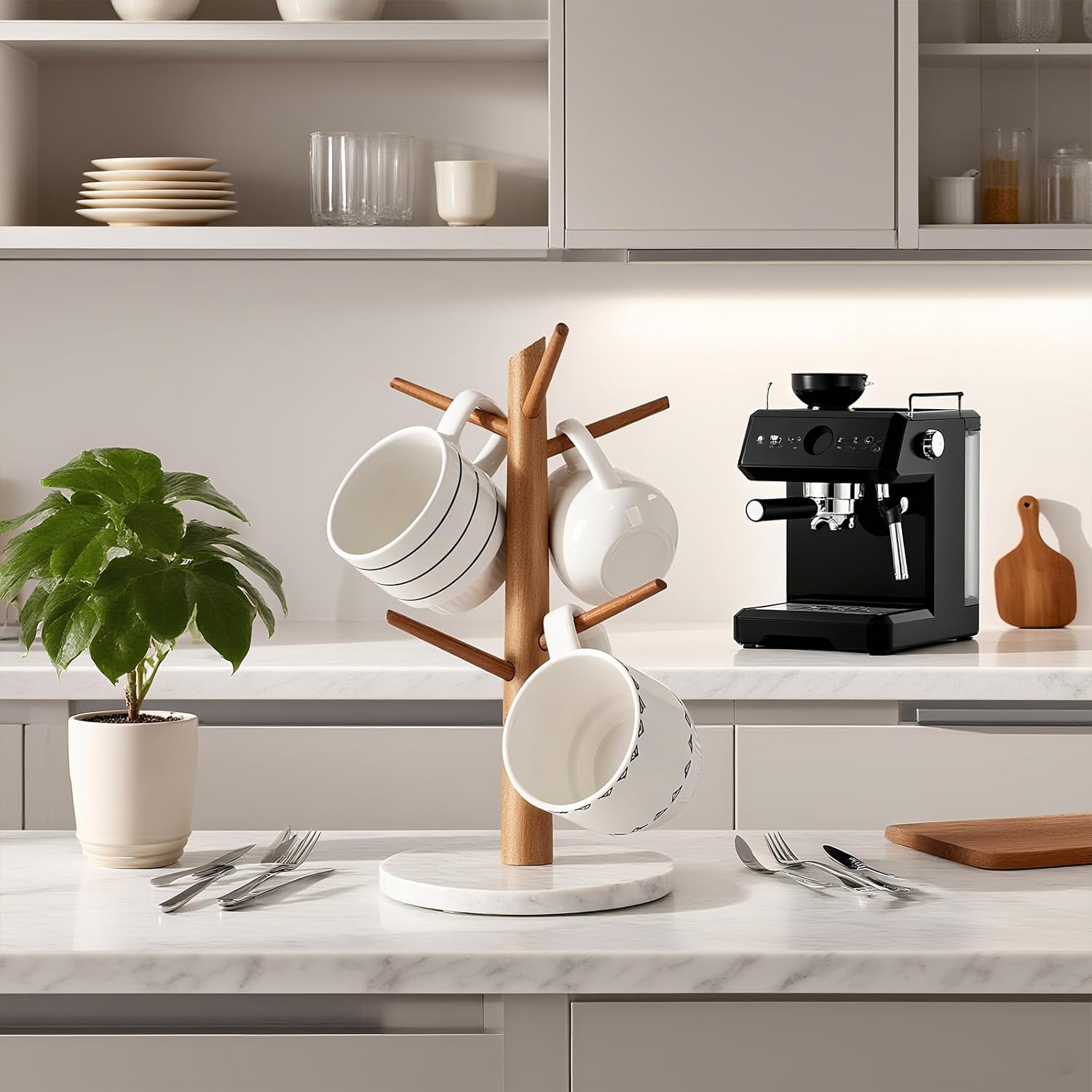 Acacia Wood Mug Tree, Marble Base Coffee Mug Tree for Counter, Mug Holder Tree with 6 Hooks for Kitchen Coffee Bar Mug Organize