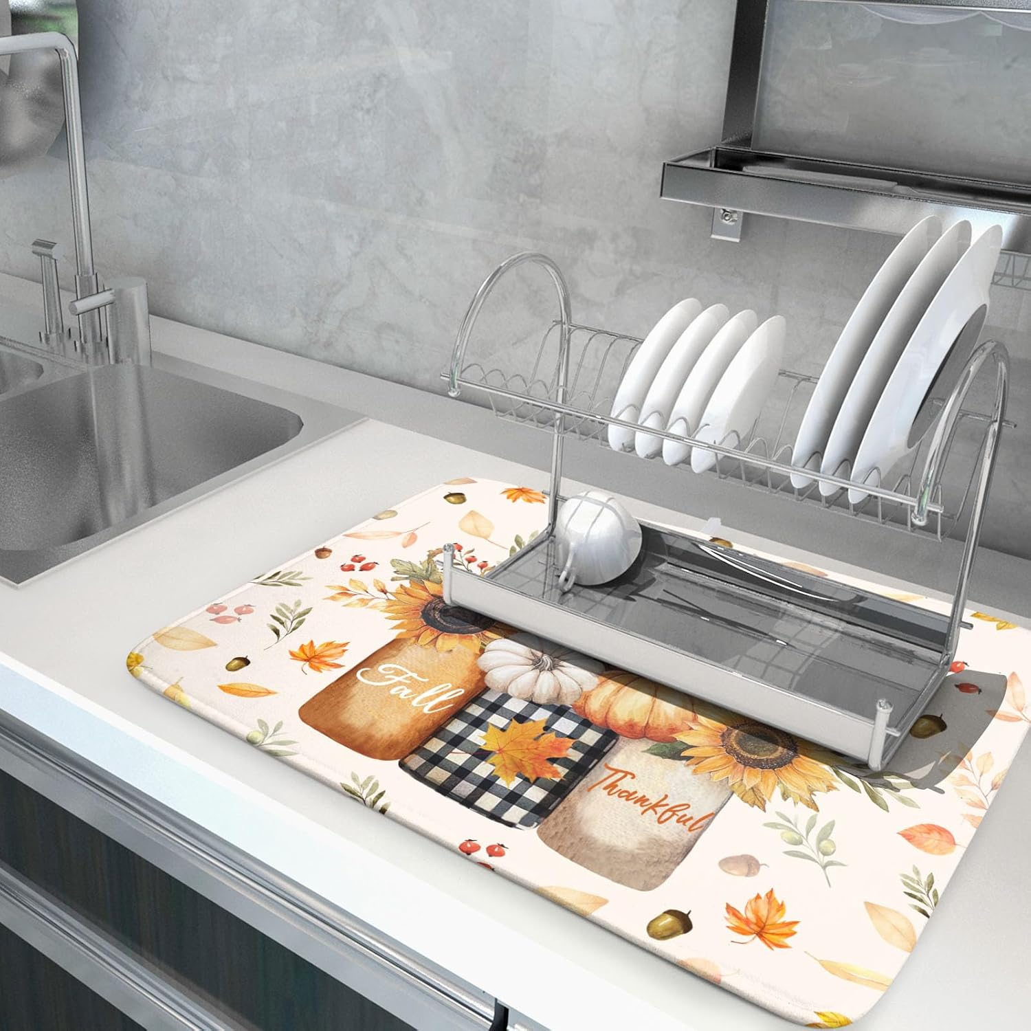 - 1【Good Material】:Our autumn drying mat is made of high absorbent microfiber and the middle is made of composite spongedurable, reversible do not fade and comfortable. At the same time, it can protect your kitchen counter from scratching by the tableware.