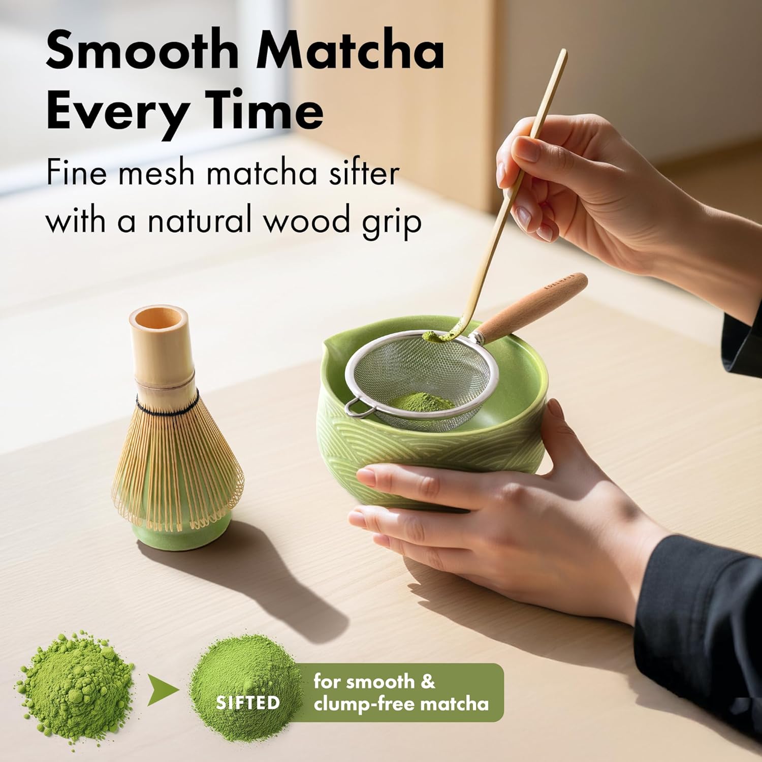 - COMPLETE MATCHA WHISK SET FOR AN AUTHENTIC EXPERIENCE: This all-in-one Matcha Set includes a handcrafted Bamboo Matcha Whisk (Chasen), Bamboo Scoop with rest, Stainless Steel Matcha Sifter, Ceramic Matcha Bowl, and Whisk Holder. Everything you need to prepare, blend, and enjoy Ceremonial Grade Matcha Powder at home or on the go.
