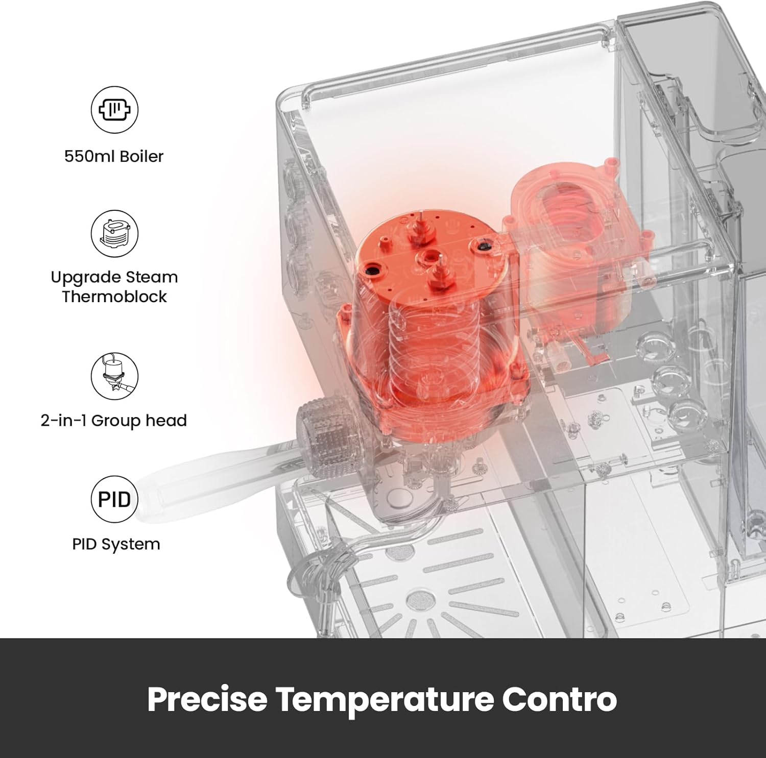 - Hybrid Boiler System: This Gemilai Espresso Machine combines a 550 ml brew boiler dedicated to the group head with a reinforced thermoblock for robust steam output. Its innovative dual water circulation design reduces heat loss, delivering stable brewing for 3–4 cups in one go. The integrated PID temperature control ensures precise heat management, enabling consistent quality and optimal flavor extraction even during continuous use
