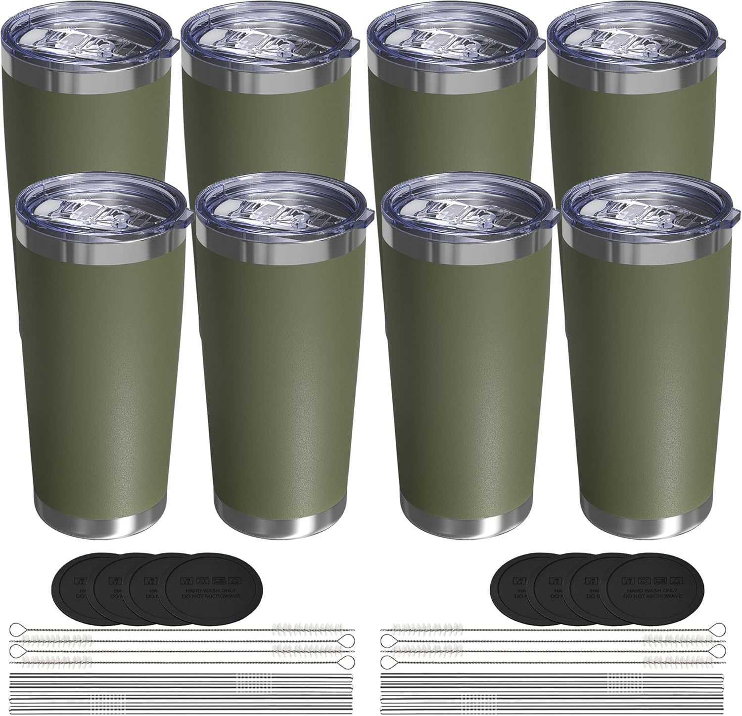 Travel Coffee Tumbler 20oz, 8 Pack Leakproof Travel Coffee Mug with Lid and Straw, Stainless Steel Double Wall Vacuum Insulated Tumbler for Hot/Iced Drinks (Textured Matte, Army Green)