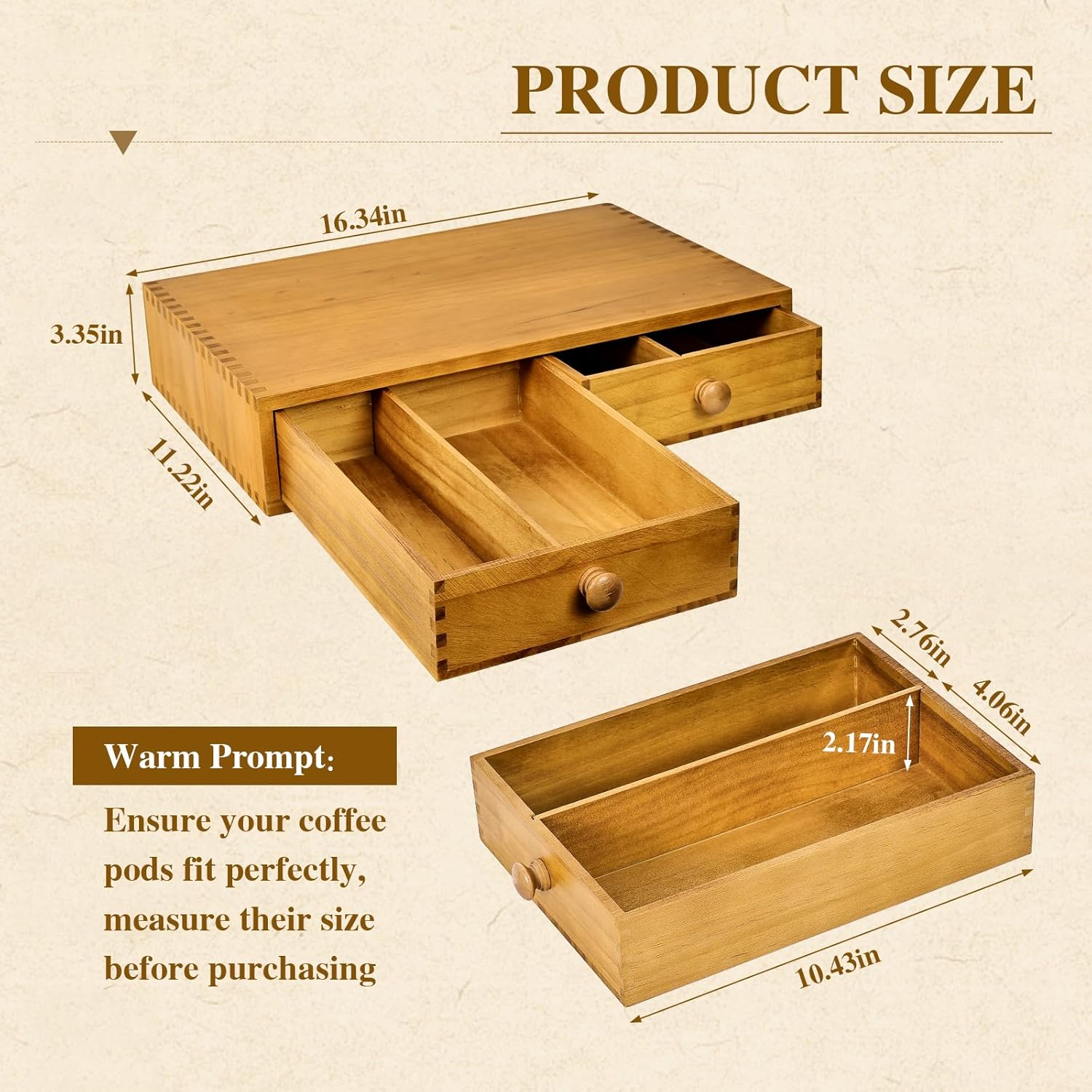 - Natural Wood:This coffee pod drawer, crafted from high-quality natural wood, offers a timeless aesthetic with its rich wood grain. This material is not only visually appealing but also highly durable and long-lasting, ensuring that your organizer remains in excellent condition for years to come. Natural wood is easy to clean, requiring only simple treatments like oiling or waxing to maintain its pristine appearance. Its sturdiness and durability make it a premium choice for coffee pod storage, adding both functionality and elegance to your kitchen or office space
