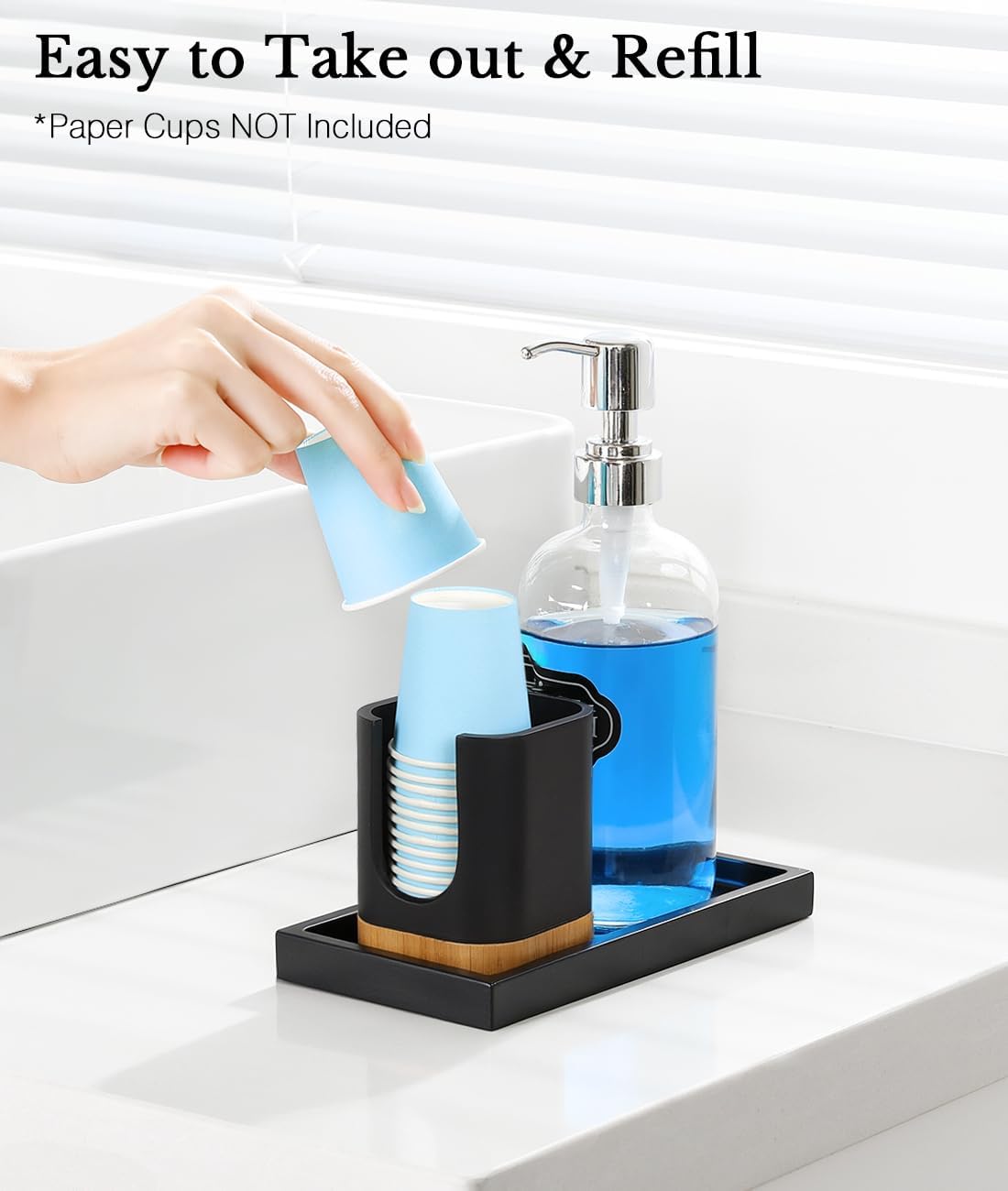 - Keeps Cups Tidy - Using a dixie cup holder is better-looking and more sanitary than stacking cups on the table. With all the cup openings facing down, the organizer keeps your cup clean and dust-free. The holder also protects cups from water on the bathroom countertop. Classy matte black and wood pattern, giving a neat and elegant look to the countertop.