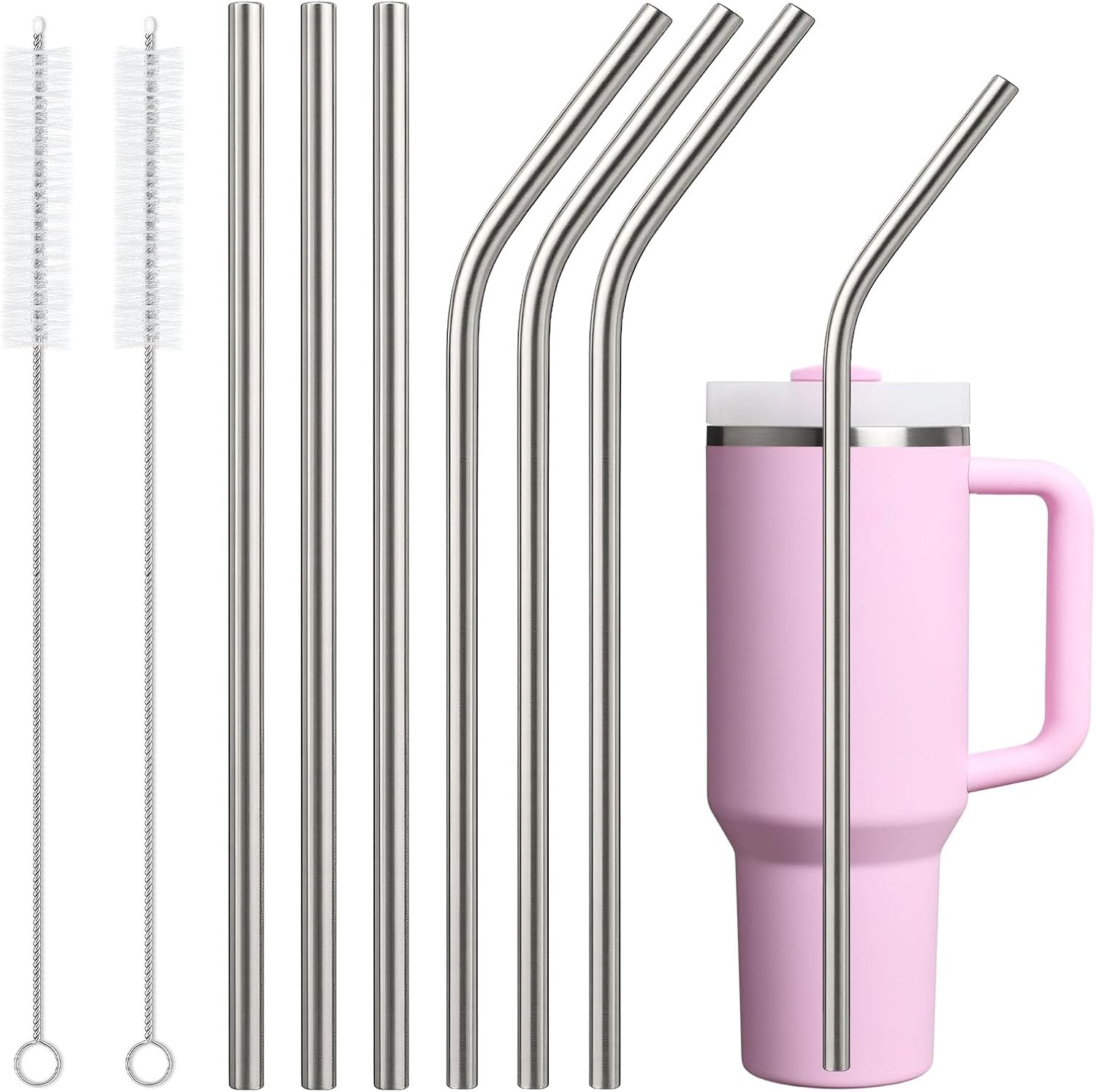 - Stainless steel straw set: 3 straight + 3 curved stainless steel straws, extra long straws 12 inches, with 2PCS cleaning brush, compatible with Stanley cups 40oz, 30oz