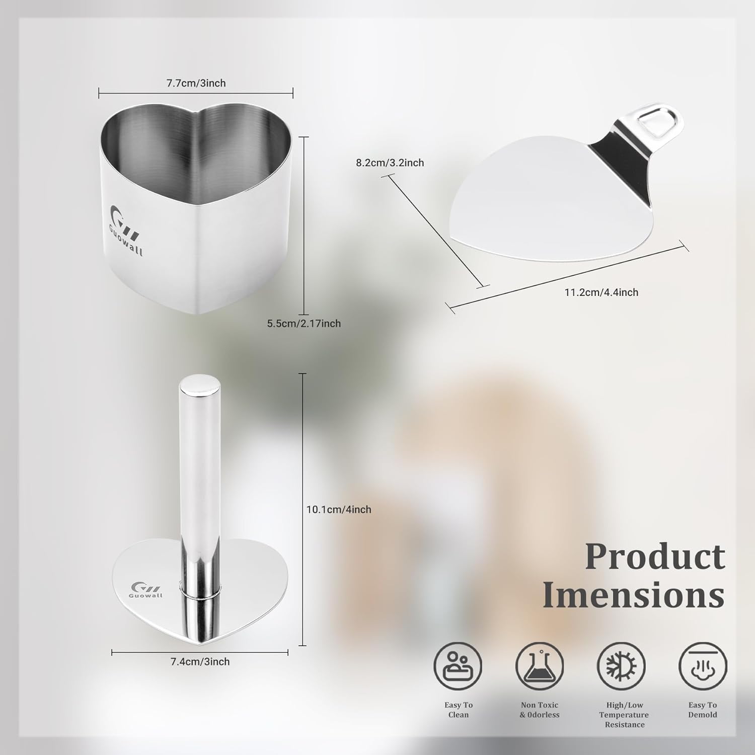Guowall Heart Shaped Seamless Cake Ring, 3 inch Mousse Mold for Baking, Nonstick Stainless Steel Heart Dessert Mould Set, Includes 1 lifter, 1 pusher and 6 rings