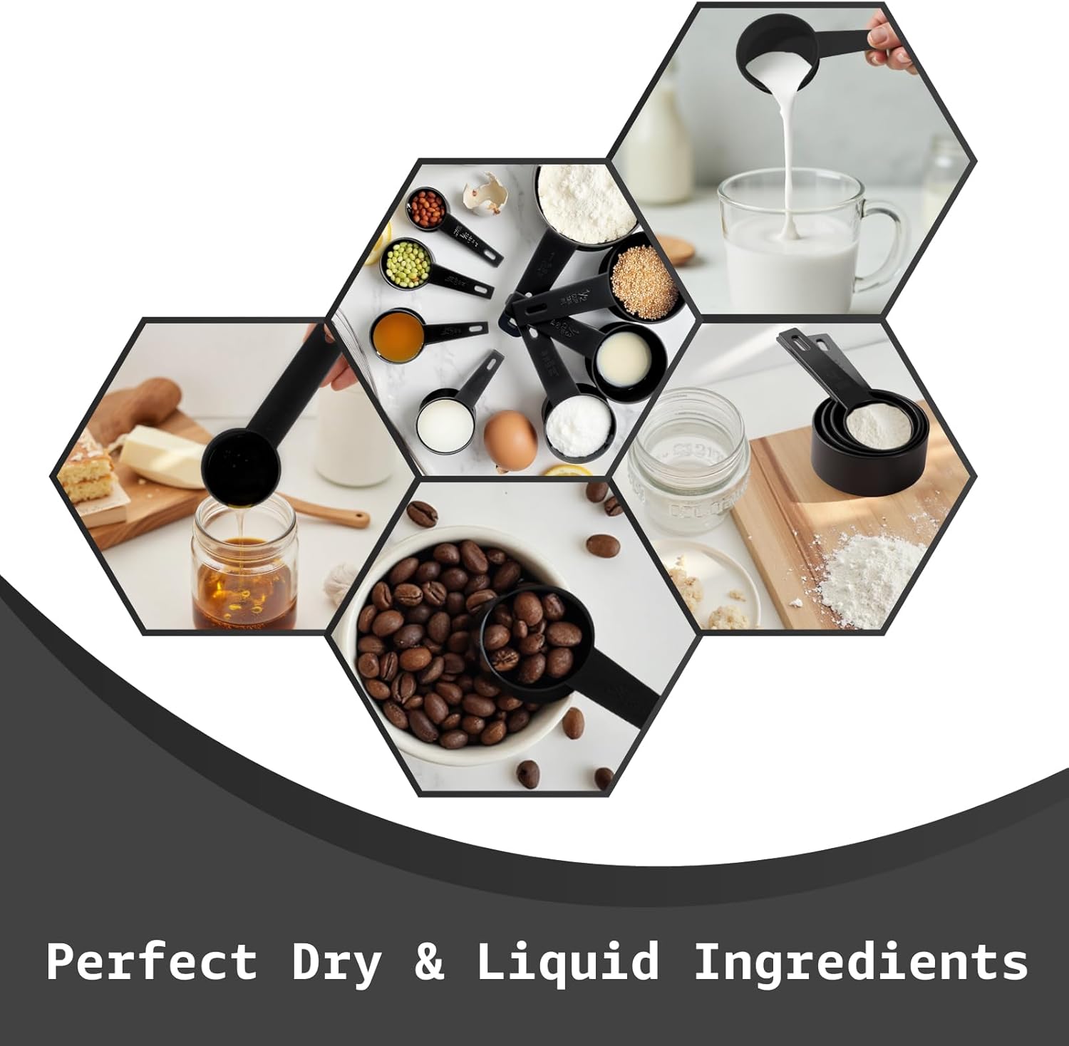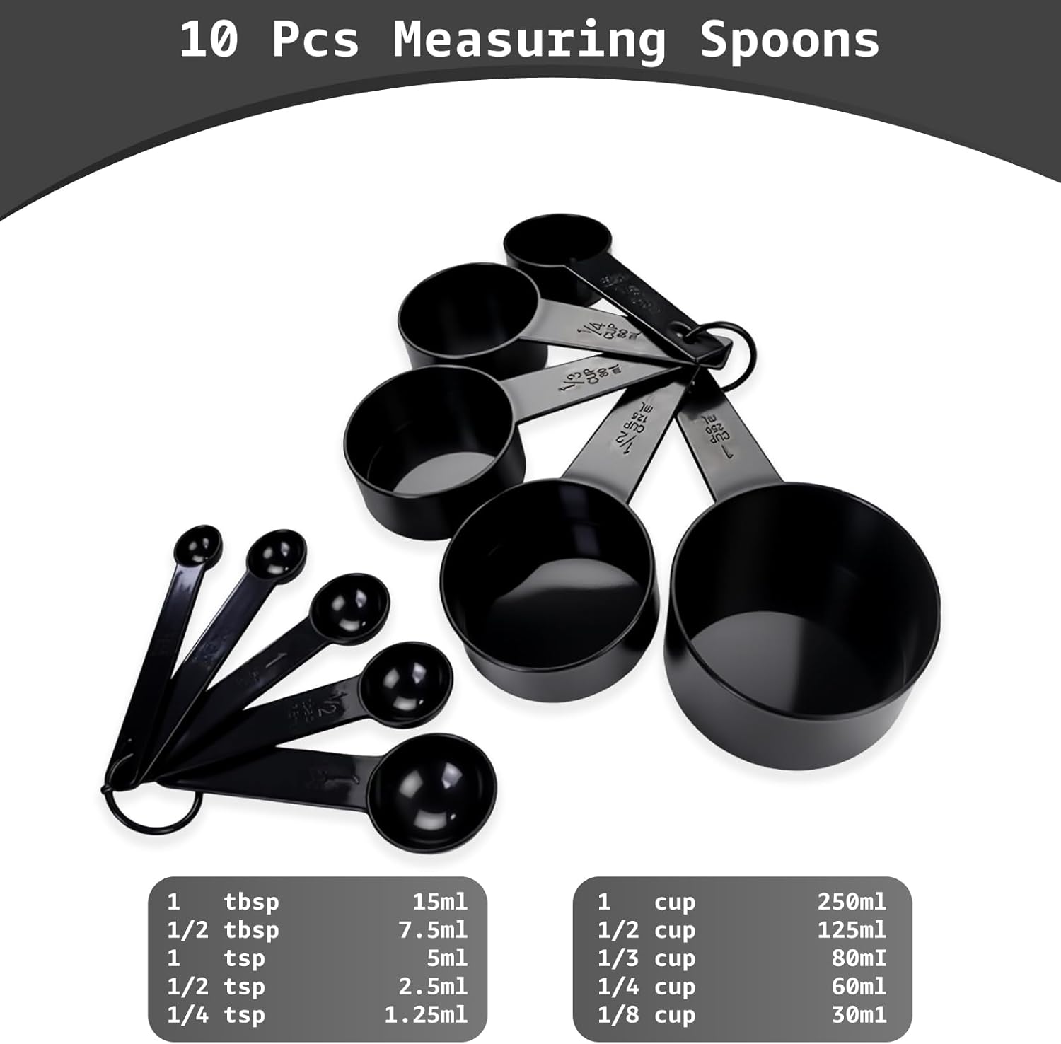 Inmorven 10pcs Measuring Cups and Spoons Set, BPA-Free Plastic Kitchen Baking Tools with Engraved Markings, Stackable Design for Dry & Liquid Ingredients (Black)