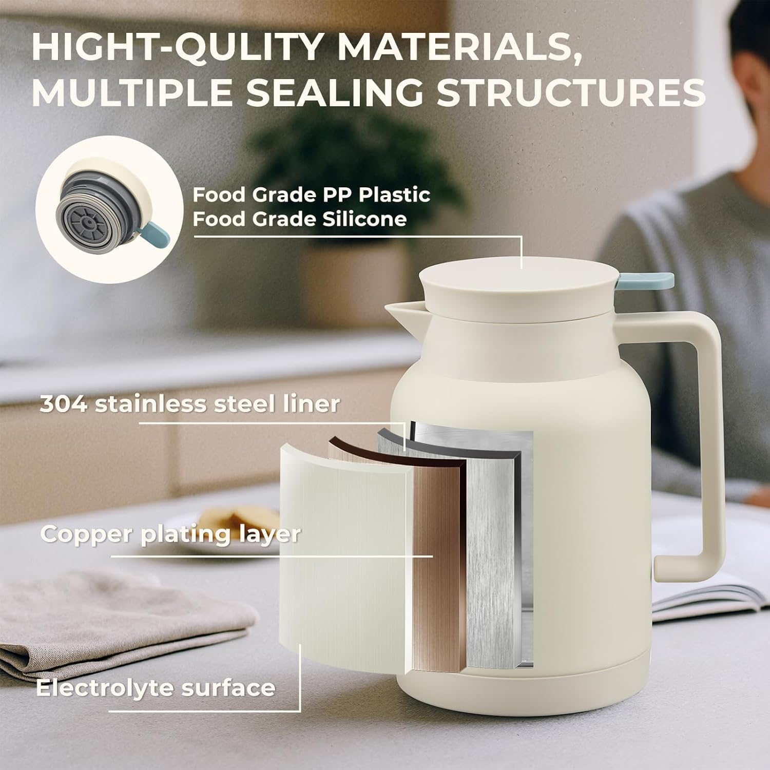 - 【LEAK PROOF】Both feature leak-proof lids. Our coffee carafe lid with food safe silicone ring, which is leak proof and always locks into place when closing your pitcher.Effectively prevent water leaking.Even with a slight tilt our thermal coffee carafe will not leak one single drip.