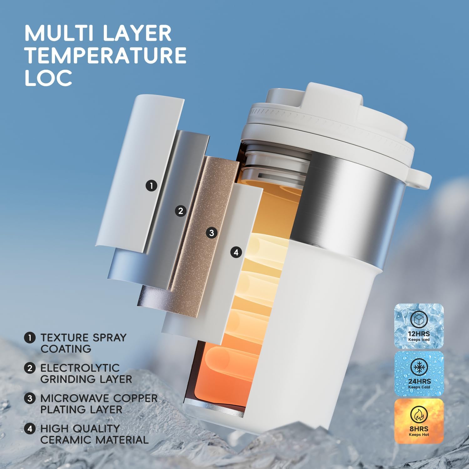 - Ceramic-Lined Interior for Pure Taste & Stain Resistance This stainless steel coffee mug features a smooth ceramic-coated inner wall, eliminating metallic aftertaste and preventing flavor transfer—ideal for coffee, tea, or water. The non-porous surface resists stains and odors, ensuring effortless cleaning after every use, just like premium coffee cups with lids.