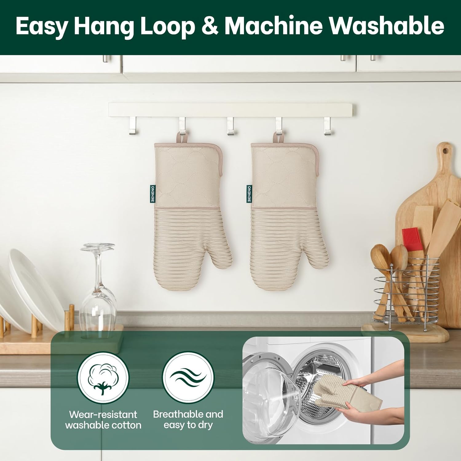 - Easy to Care & Easy to Store: Designed for busy kitchens, these oven mitts are completely machine washable to maintain freshness after long term cooking use, the built-in hanging loop provides instant organization, keep them within reach while adding a stylish touch to your kitchen decor
