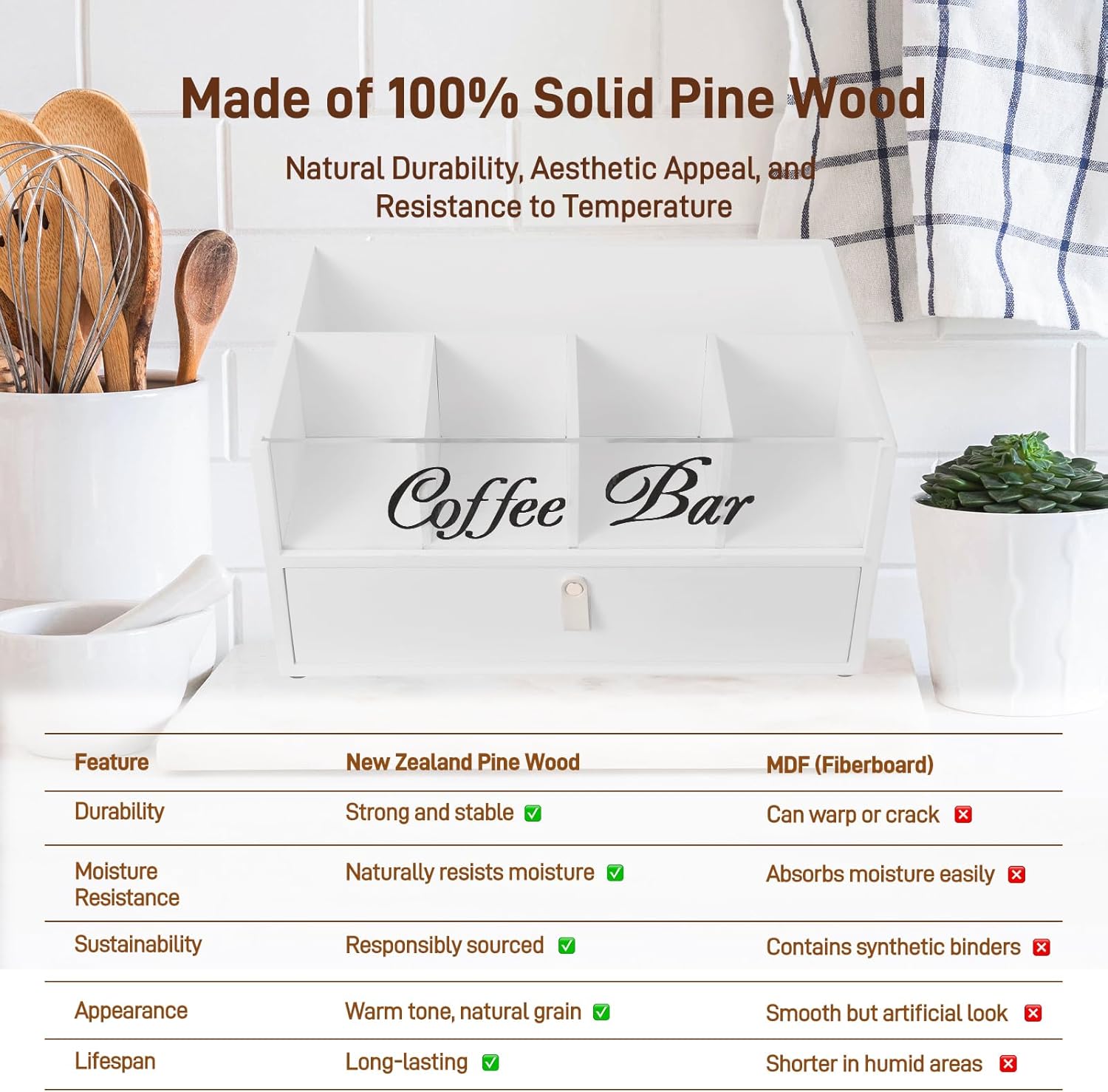 - 【Functional, Stylish, High-Quality Solid Wood Coffee Storage Box】Our wooden coffee storage box is a stylish and practical addition to any setting—whether at home, in the office, on a hotel welcome table, in a coffee shop, break room, or meeting area. It keeps all your coffee essentials—snacks, beverages, creamers, sugar, and biscuits—neatly organized in one place. No more searching around—everything is within easy reach, and everyone knows exactly where to find their favorite coffee-time items.