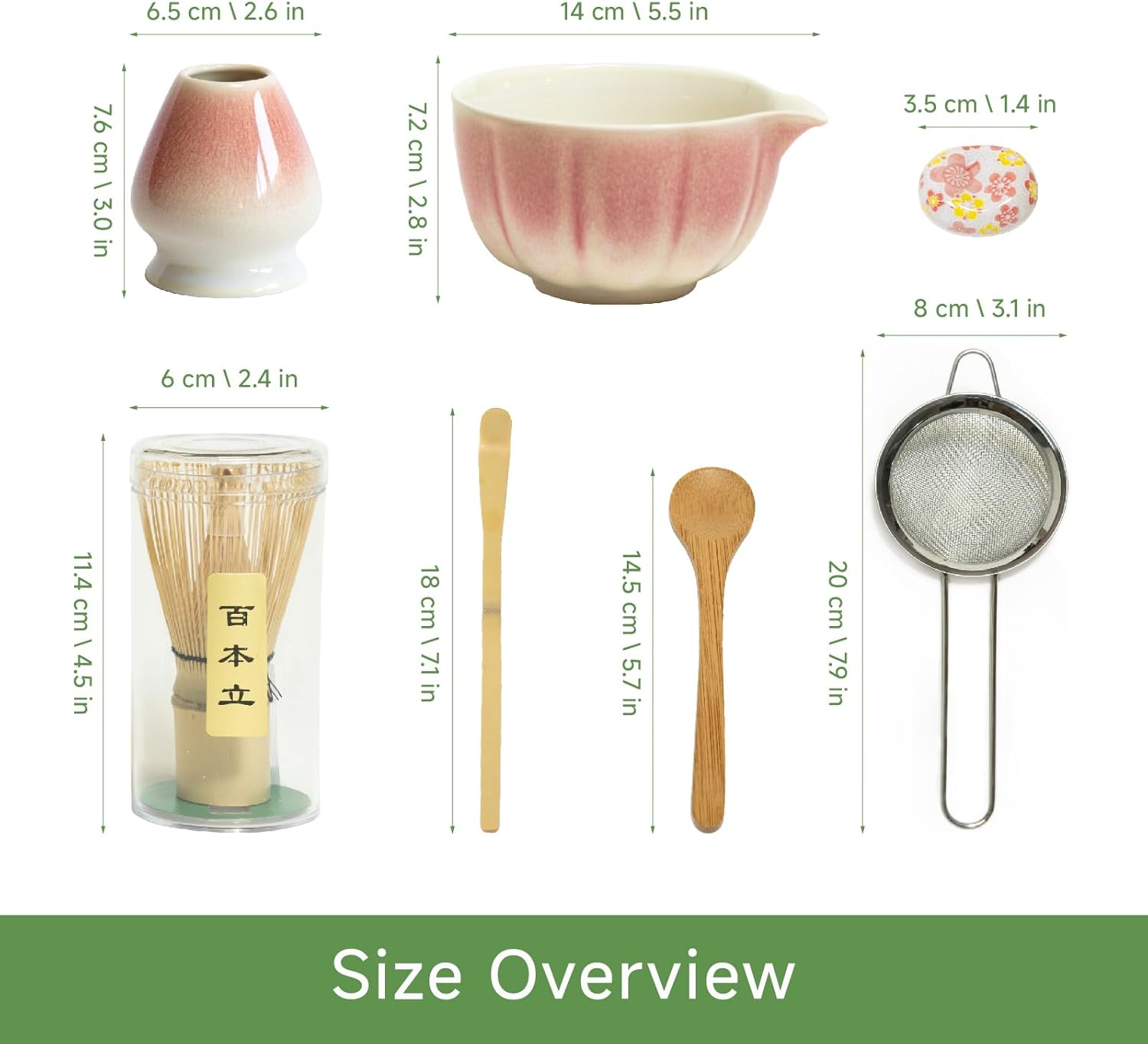 - All-in-One Matcha Whisk Set for Home or Ceremony- This 7-piece matcha set includes a handcrafted matcha bowl with spout, 100-prong bamboo matcha whisk (chasen), ceramic whisk holder, bamboo scoop (chashaku), scoop rest, and stainless steel matcha sifter. Ideal for beginners or experts seeking a complete matcha kit for authentic tea preparation.