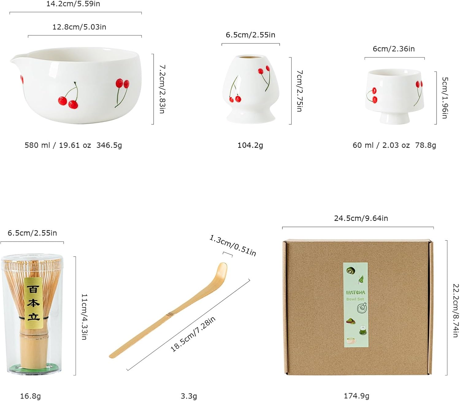 - ✅ Cherry Matcha Set – Full Kit – You’ll receive a complete matcha set that’s as sweet as it looks: 1 cherry-themed matcha bowl (580ml), 2 matching cups, a bamboo whisk, scoop, and whisk holder. This set has everything you need to start your own tea ritual at home or gift someone special.