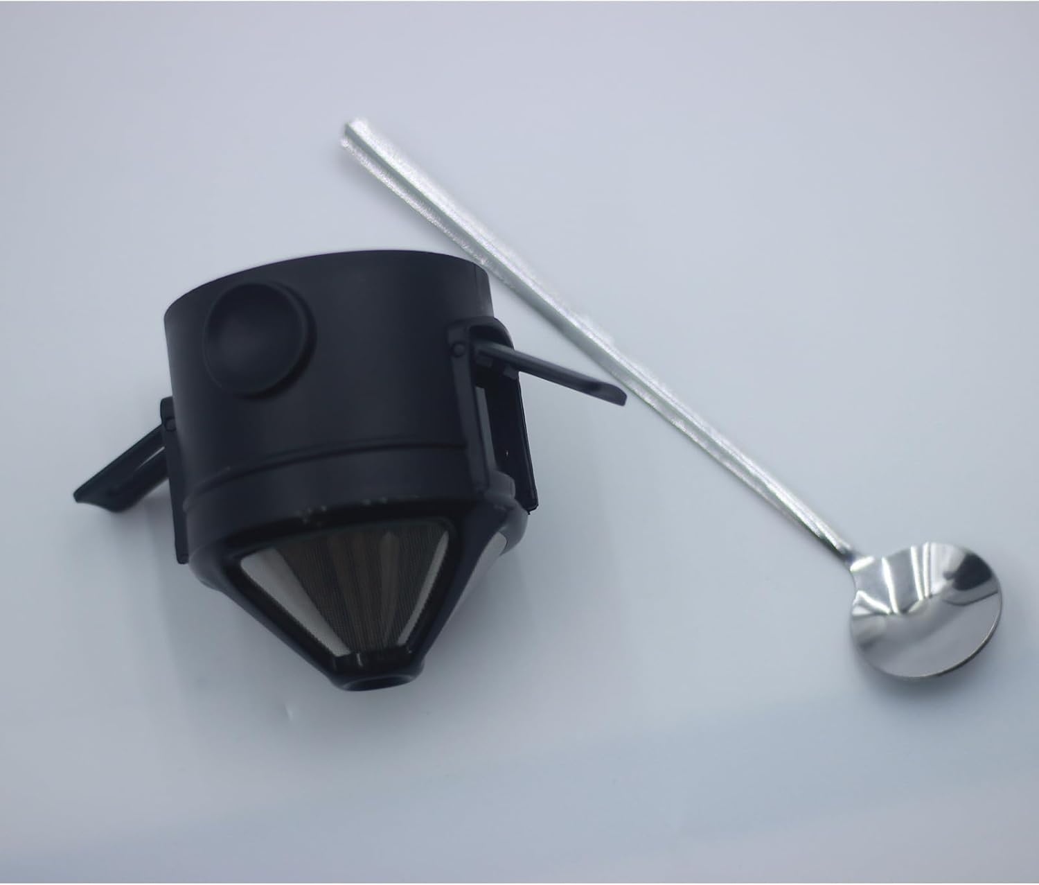 - 【All-in-One Travel Coffee Maker for Camping】 Brew your coffee anywhere with this all-in-one mug – includes a reusable stainless steel pour-over filter and a stirrer. No paper filters needed, eco-friendly and mess-free.