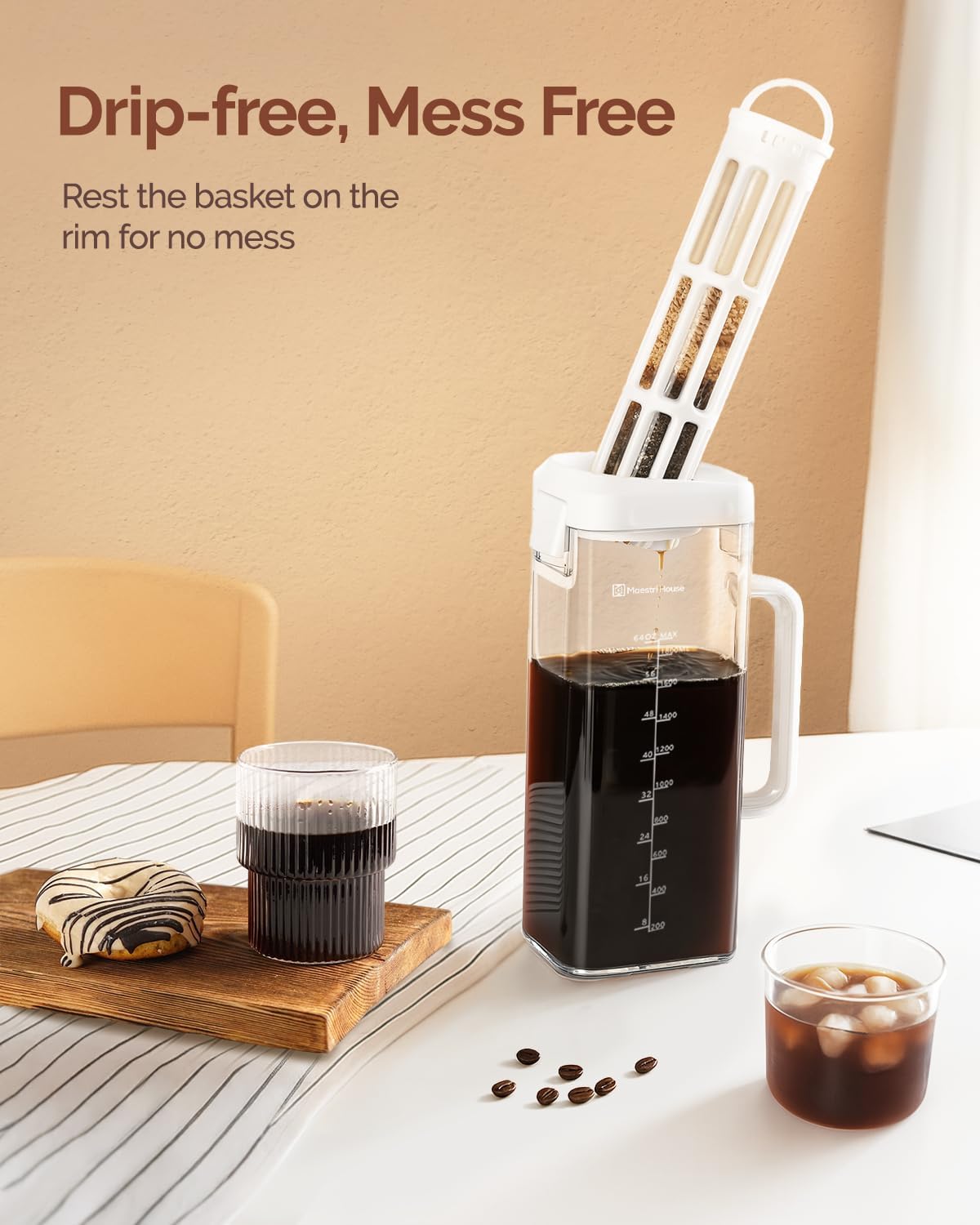 - Convenient Design: Cold brew pitcher and its filter are designed with precise scales on its body for accurate coffee making ratio. This coffee maker brewer’s filter with removable bottom cover is easier to clean residues compared with all-in-one filter. Top cover on powder compartment prevents coffee powder floating, ensures thorough immersion, and keeps lid clean. Filter can be placed at spout to prevent spills, enhancing convenience and cleanliness.