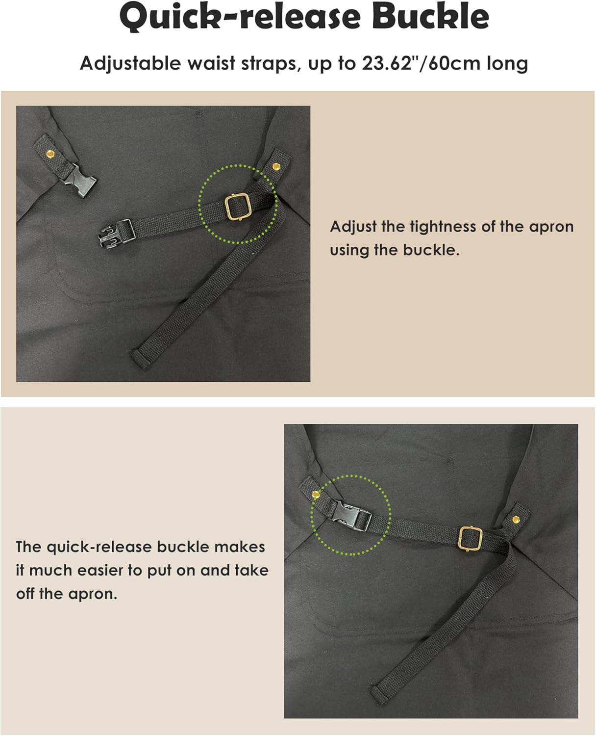 - Quick-release Buckle: Adjustable waist straps, up to 23.6"/60cm long; Quick-release buckle design for easy on and off