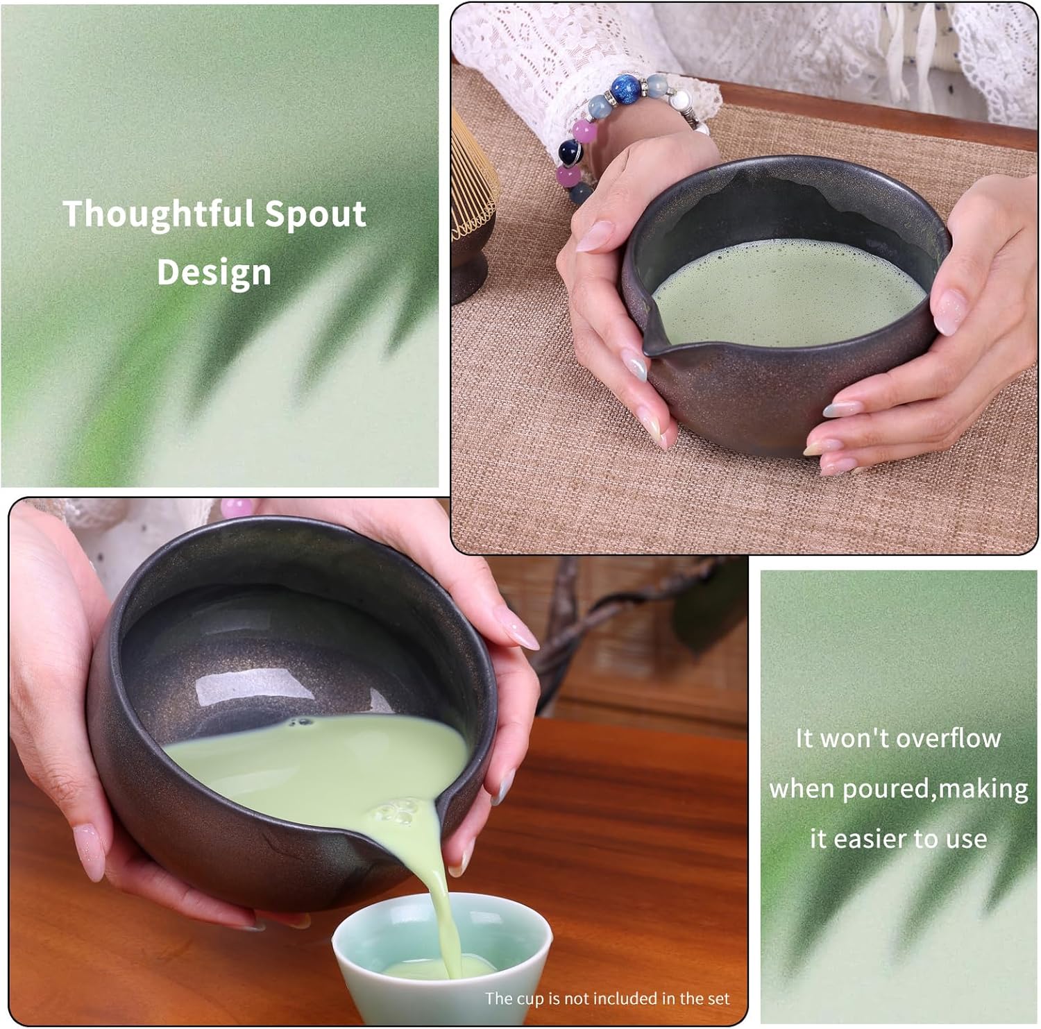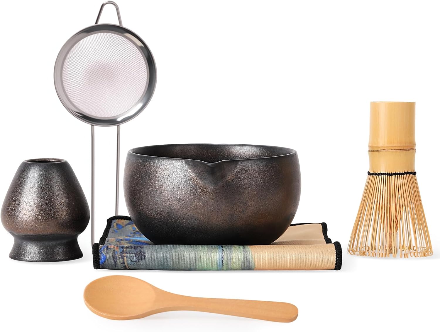- Everything You Need: Includes:Ceramic matcha bowl with spout,Bamboo whisk + ceramic holder,Stainless sifter, bamboo scoop, microfiber towel