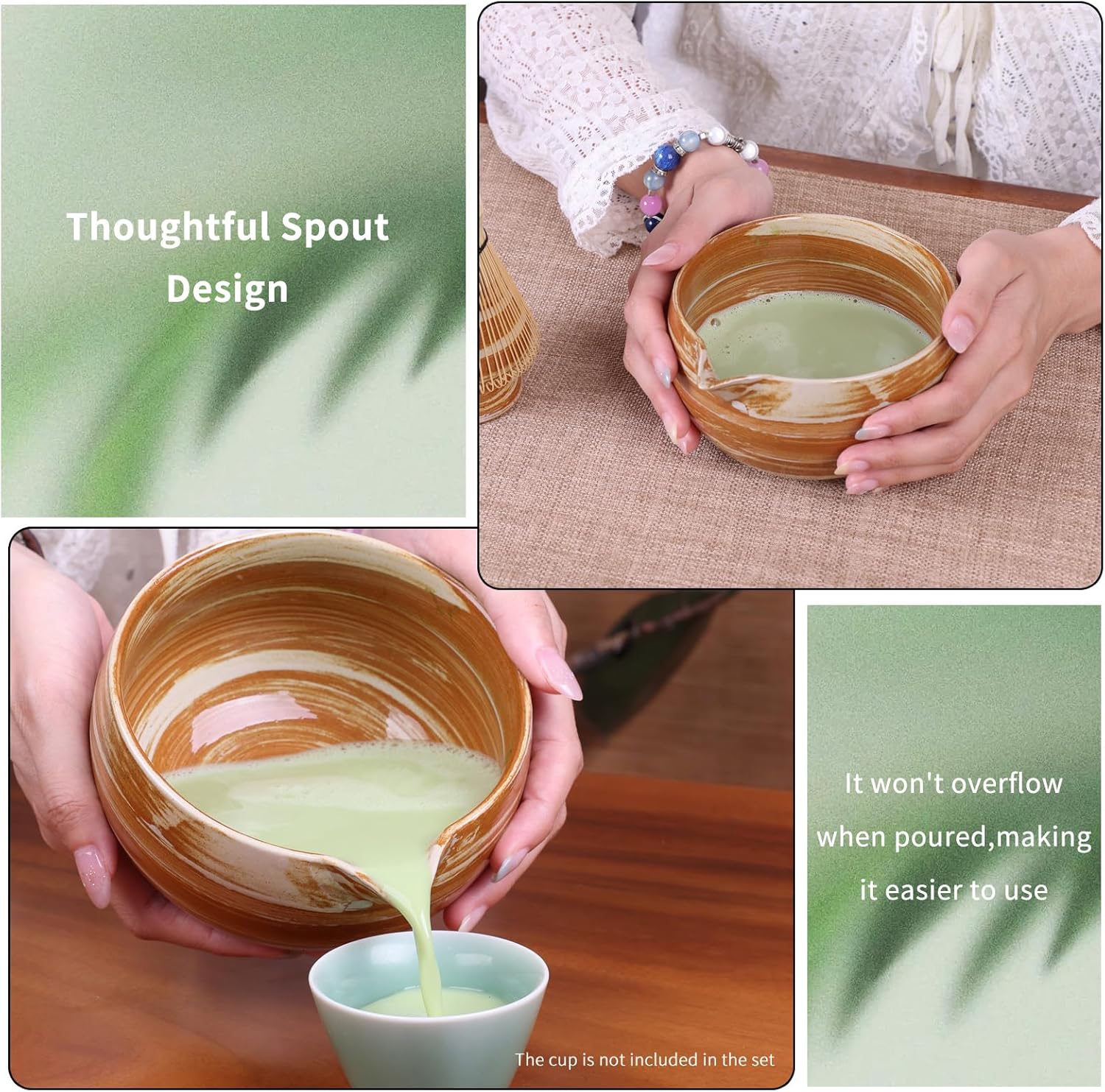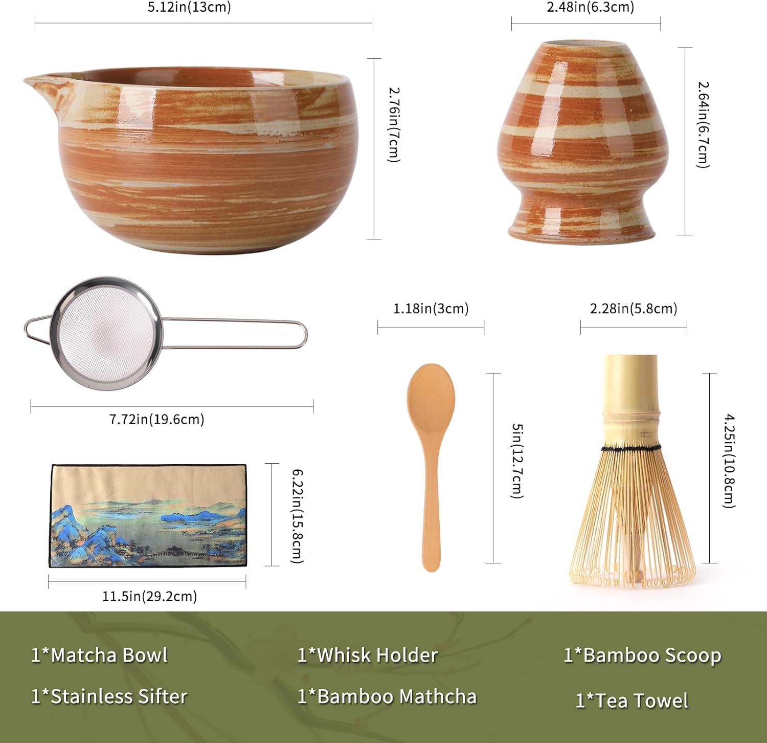 - Everything You Need: Includes:Ceramic matcha bowl with spout,Bamboo whisk + ceramic holder,Stainless sifter, bamboo scoop, microfiber towel