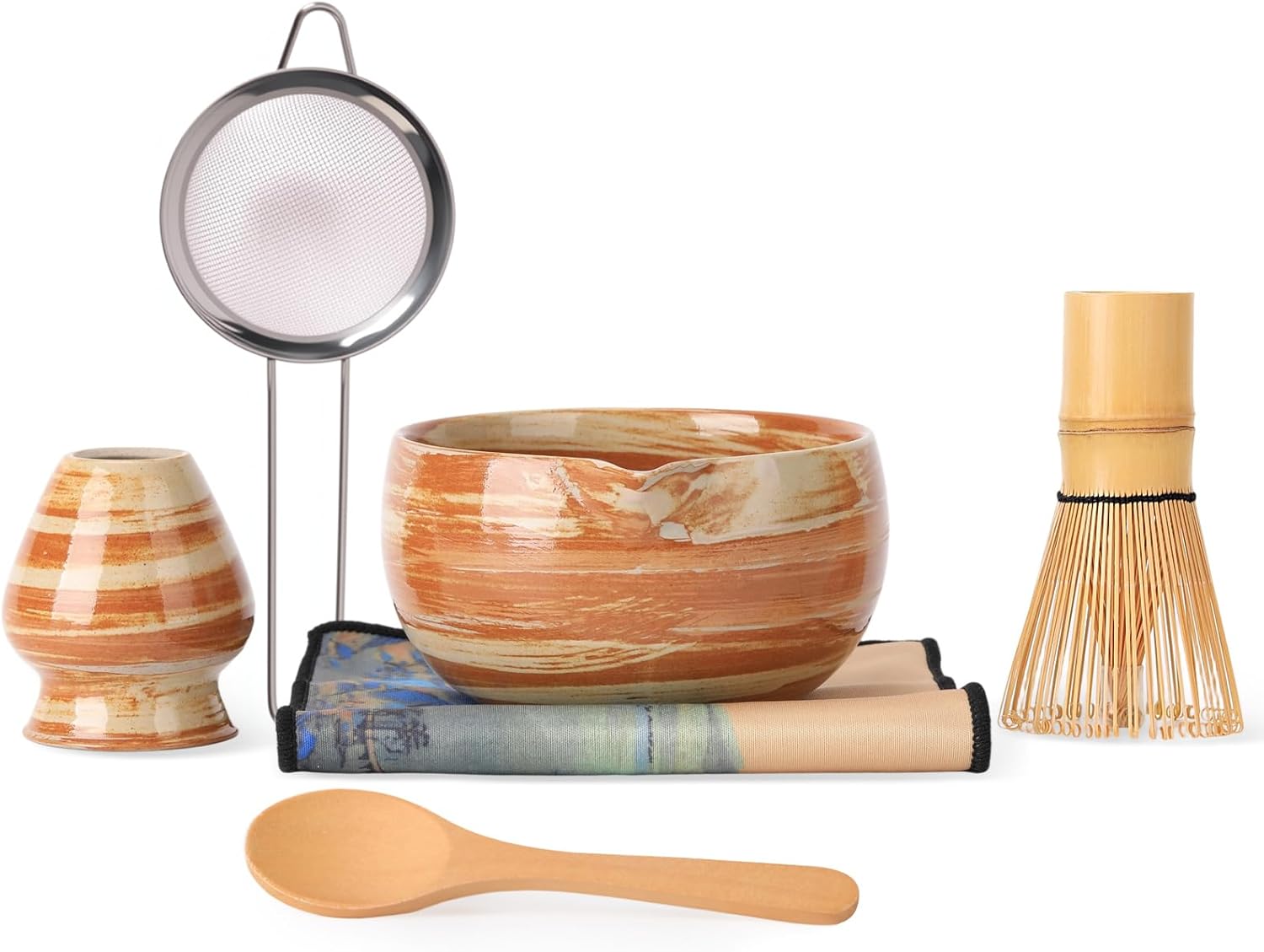 - Your Complete Matcha Starter Kit:Jumpstart matcha rituals with this 6-piece matcha whisk set. The 100-prong chasen creates silky foam fast, while the spouted ceramic bowl pours cleanly. Includes stainless steel sifter for lump-free powder—perfect for beginners and matcha lovers!
