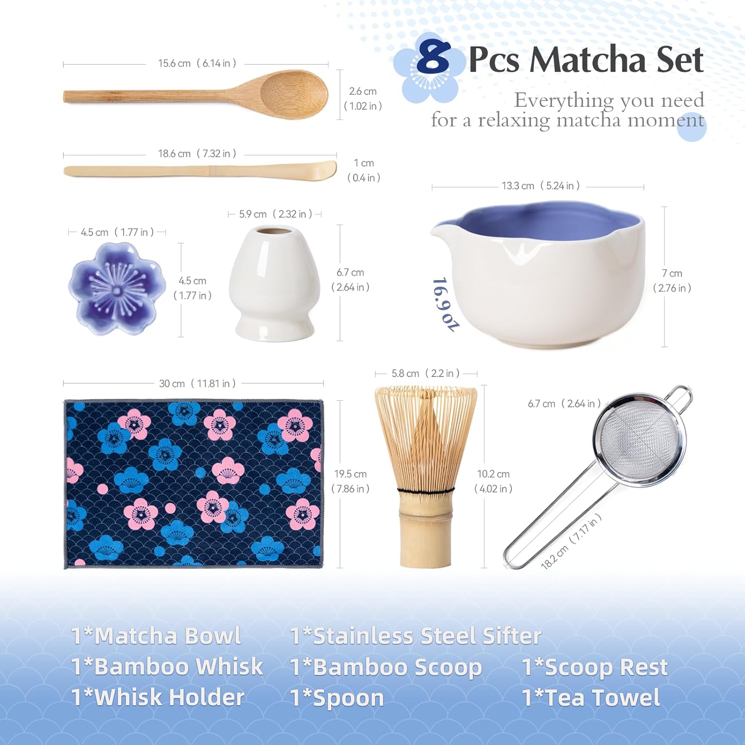 Matcha Set, 8Pcs Floral Ceramic Matcha Set with Matcha Whisk, Holder, Scoop, Scoop Rest, Sifter, Spoon and Tea Towel - Thoughtful Matcha Whisk Set Gift for Matcha Lovers (Beige & Blue)