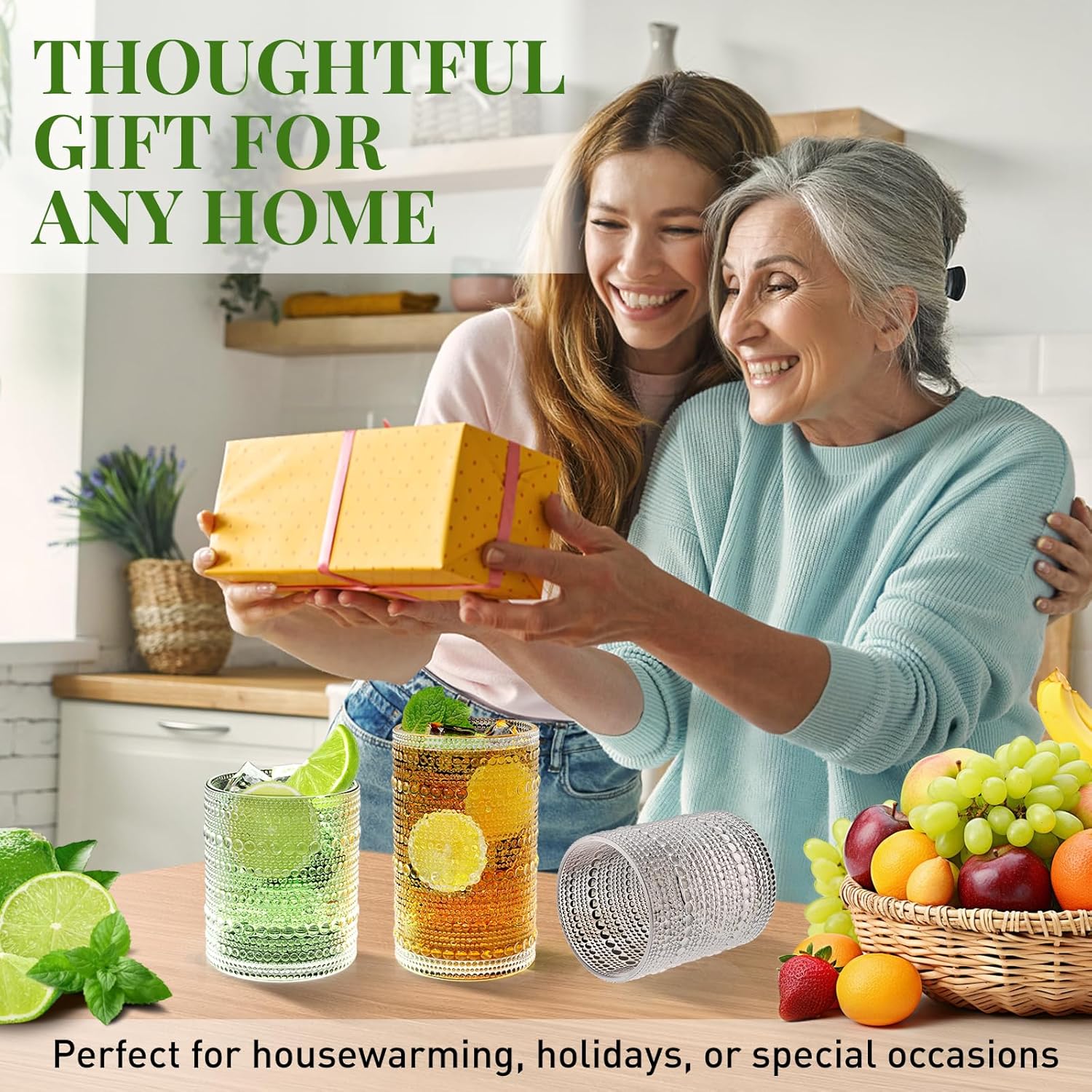 - The hobnail drinking glasses are not only cocktail glasses, but also great decorations for your room or dining table. You can place pampas grass or small bouquets of flowers, office supplies, toothbrushes and other items in the vintage embossed glass cups. The hobnail drinking glasses set makes a perfect gift for any occasion, whether it's Mother's Day, Thanksgiving, Birthday, Wedding, Christmas, or a housewarming gift.