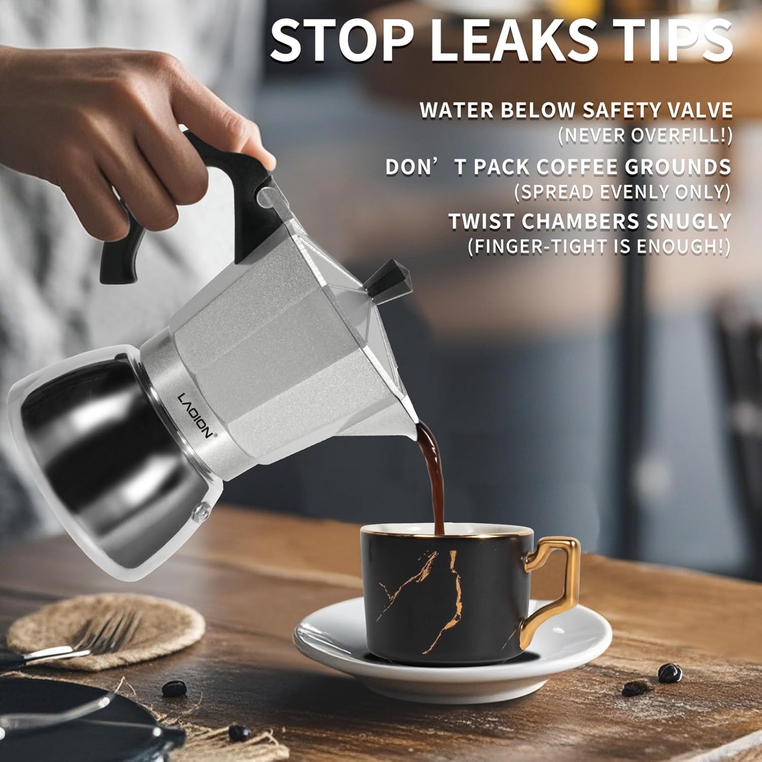 - 【Quick Tips to Prevent Leaks】1.When adding water, NEVER fill past the safety valve - this is the #1 cause of spills. 2.For coffee grounds, just spread them evenly - don't pack or overfill. 3.Before brewing, always twist the top and bottom chambers until snug (finger-tight is enough!). These simple steps keep your moka pot leak-free. Happy brewing!