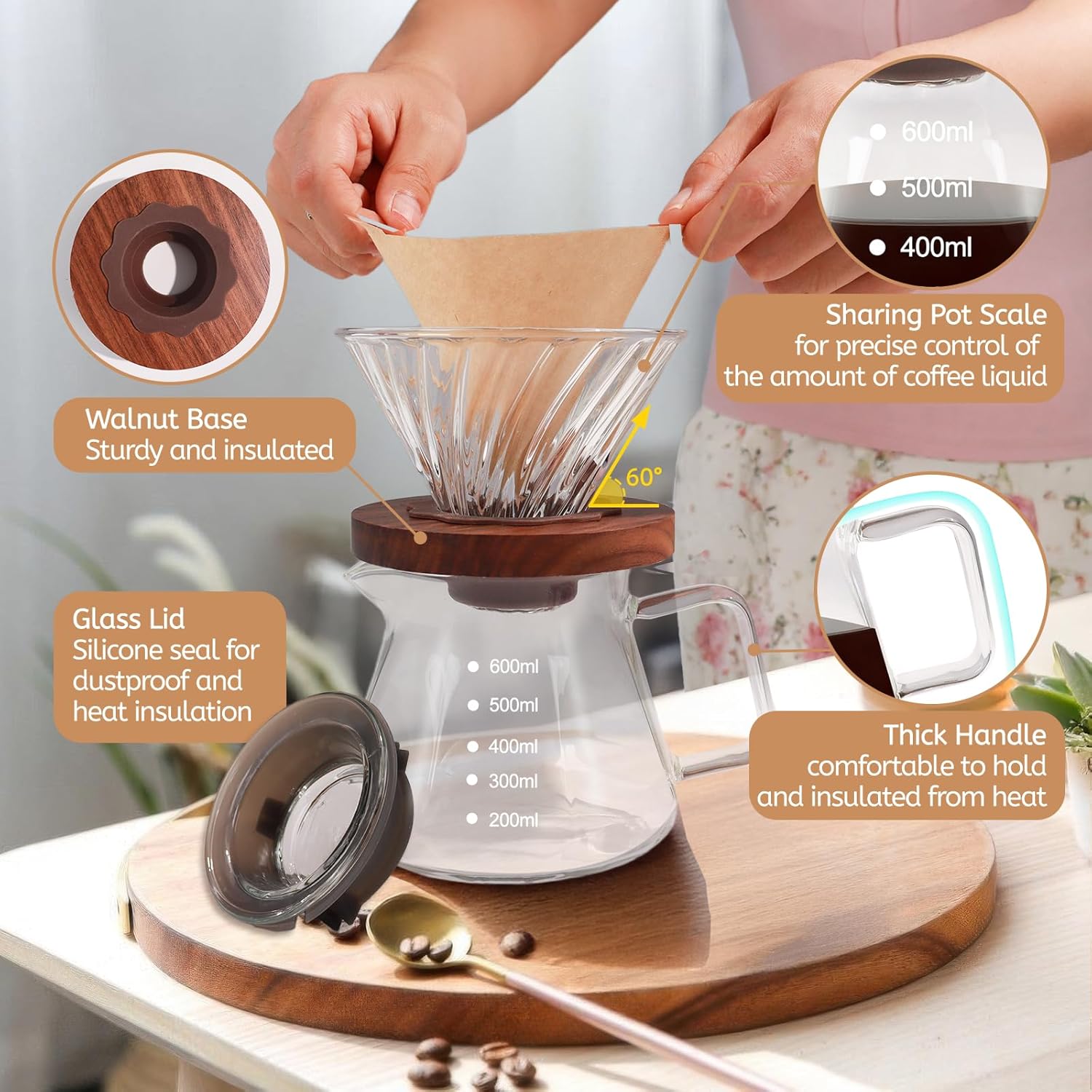 - Gift Set: This 5-in-1 hand brewing pour over coffee set includes 100pcs V60 cone paper filters, pour over drip tip, walnut base, glass sealing lid and sharing pot, a one-stop shop for all your hand brewing coffee needs. Whether it's for daily use at home or leisure time in the office, you can easily enjoy a professional-grade hand brewing experience. With exquisite workmanship and thoughtful design, it is a great gift for coffee lovers