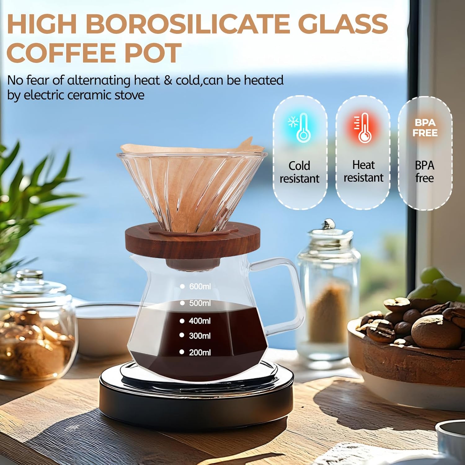 Pour Over Coffee Maker 600ml Borosilicate Glass Drip Coffeemaker Server Set with 100pcs V60 Cone Paper Filters Walnut Collar Glass Lid Clear Hand Brew Dripper Carafe for Home Camping Travel 20.29oz