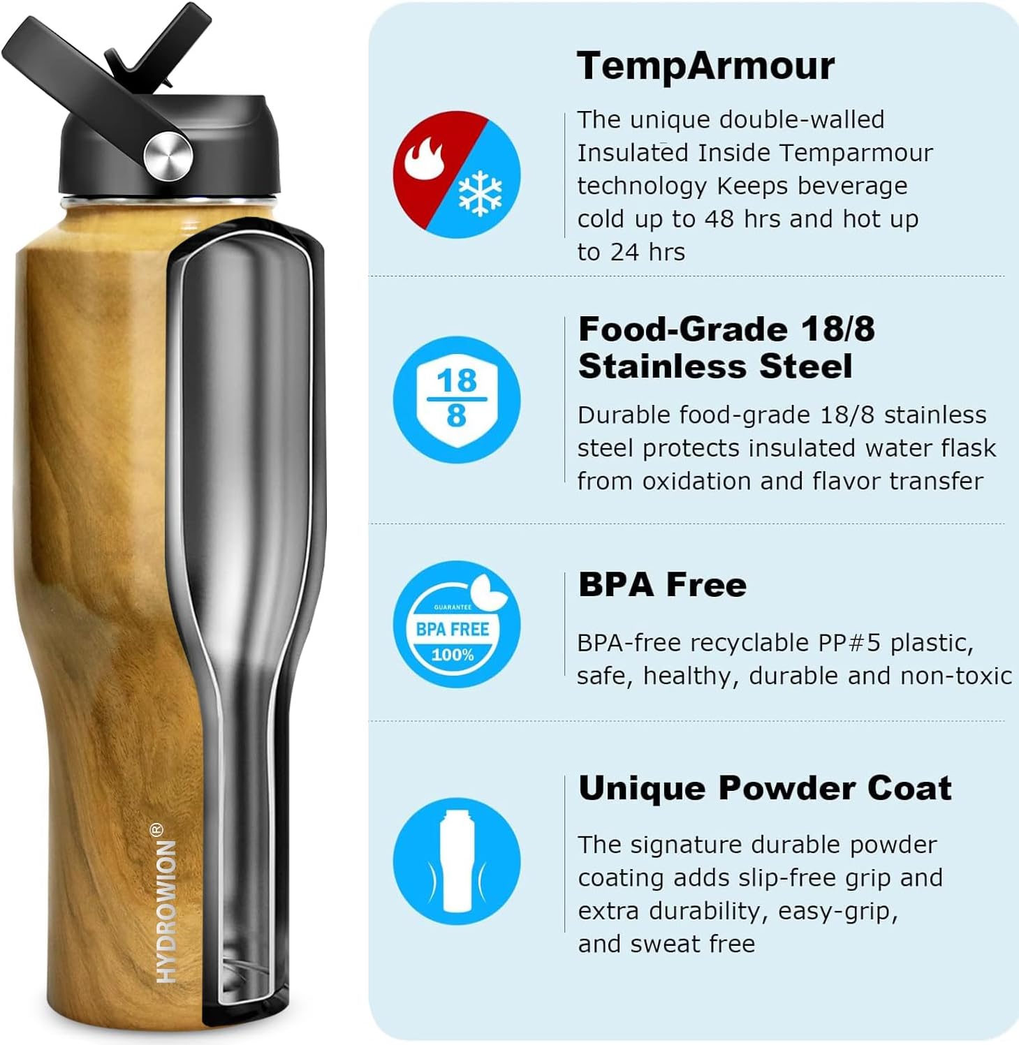HYDROWION 40 oz Insulated Water Bottle with Straw fit in Car Cup Holder(Cold 48 hrs, Hot 24 hrs) Drinking Bottle with Straw Lid, Spout Lid and Flex Cap Leakproof Travel Thermo Mug,Wood