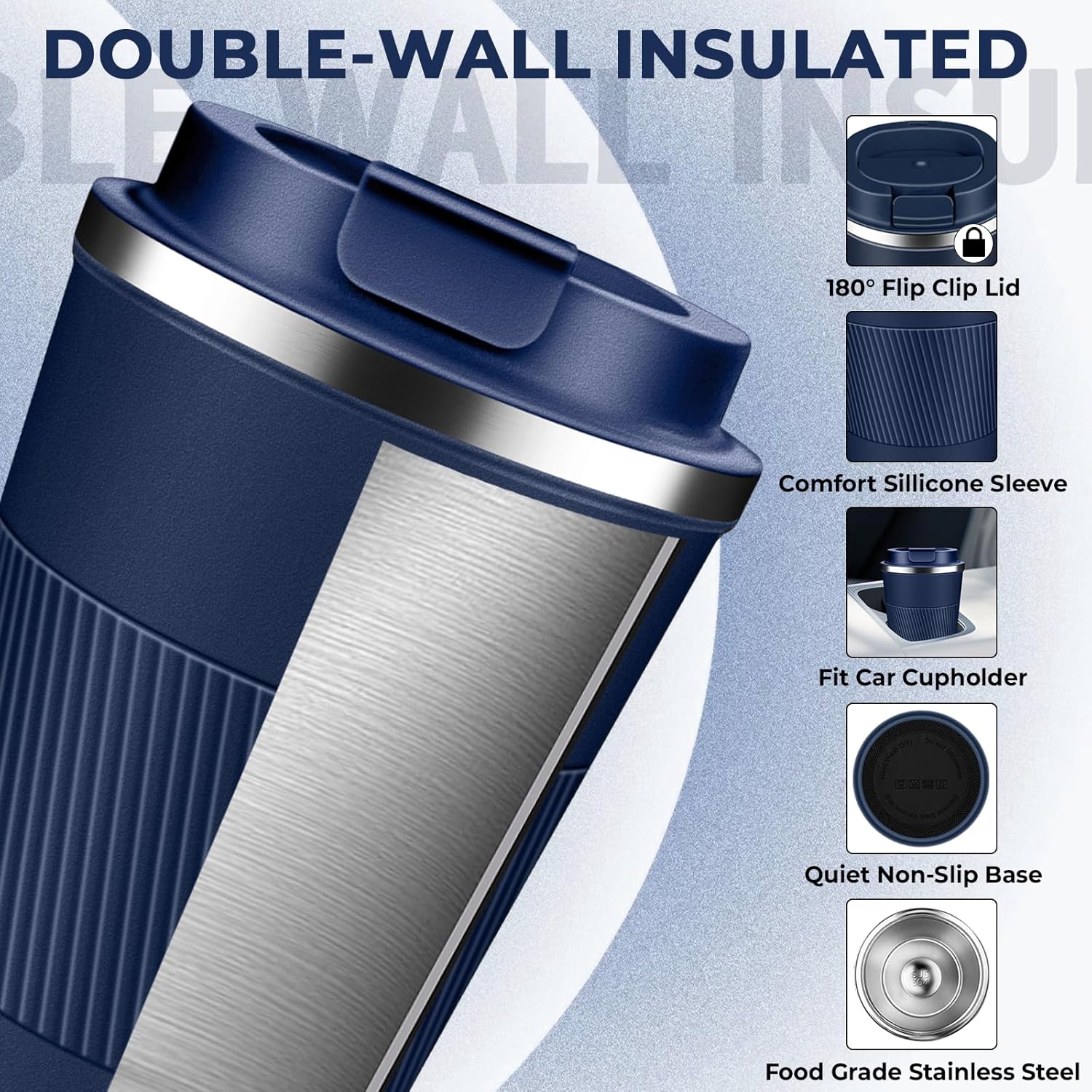 Insulated Coffee Tumbler 17 oz, Stainless Steel Coffee Mug with Lids, Travel Coffee Mug Leak Proof, Double Wall Vacuum Insulated Reusable Coffee Cup, Keep Drinks Hot and Cold (Navy Blue, 17 Ounces)