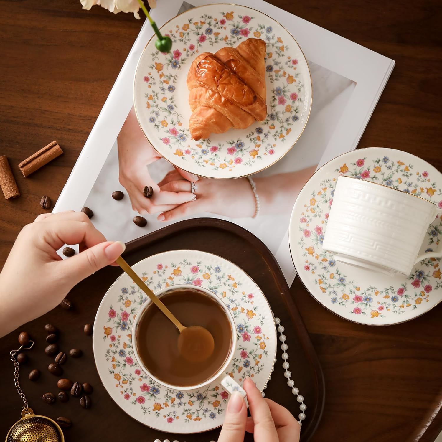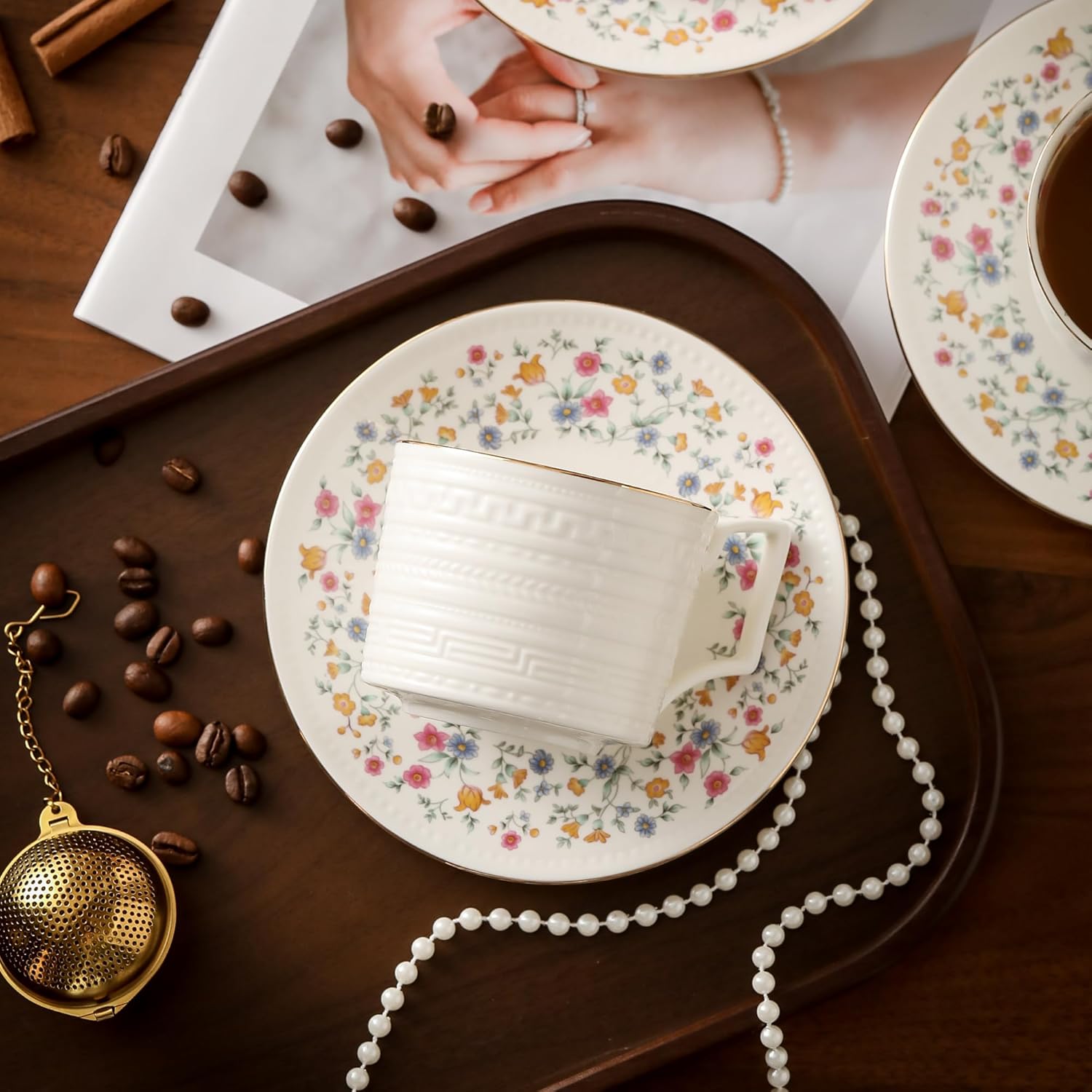 Tea Cups and Saucer Sets,8.8 oz Cappuccino Cups with Saucers and Spoons,3 Pieces, Vintage Style,Embossed Bone China Coffee Cup & Saucer Set For Women Wedding/Birthday/Christmas Gift