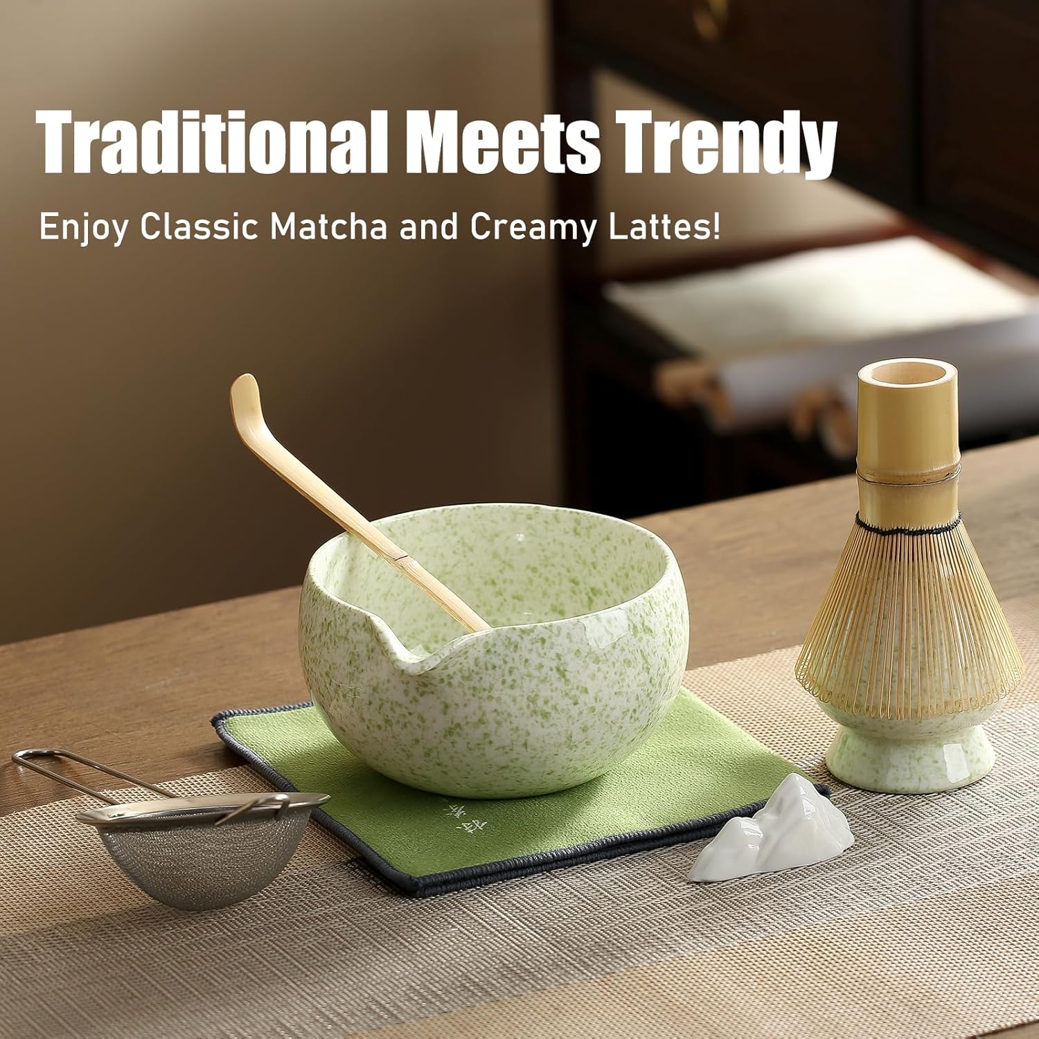 - 7-Pcs Matcha Whisk Set Include: 1*500ml/18oz Ceramic Matcha Bowl with Spout (chawan) , 1*Bamboo Whisk, 1*Bamboo Scoop (chashaku), 1*Cermaic Whisk Holder, 1*Ceramic Scoop Stand, 1*Cotton Tea Cloth (chakin), 1*Matcha Powder Stainless Sifte