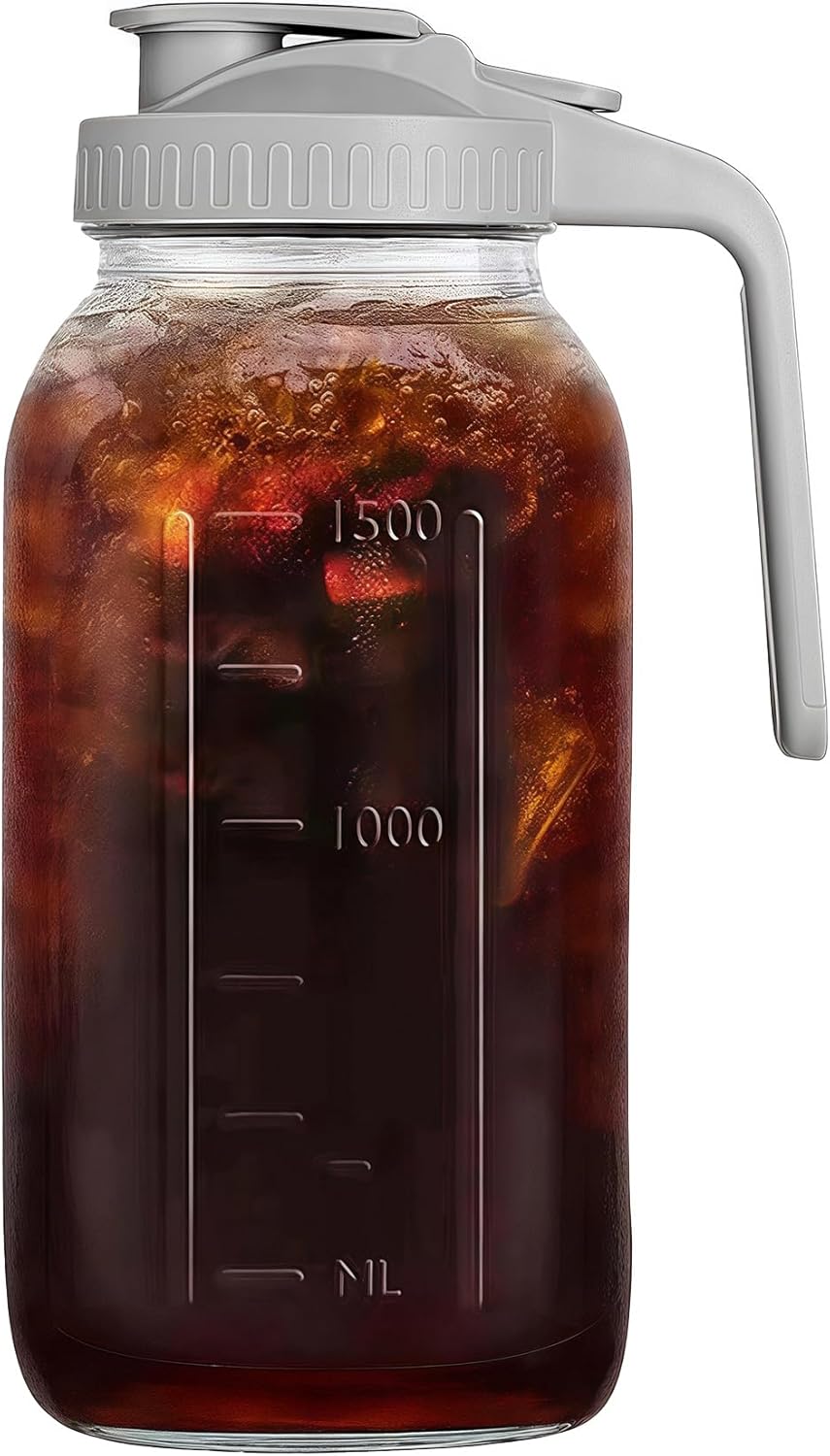 - 【One Pitcher - Endless Drinks】The glass pitchers with handle and lid is a perfect choice for making sun tea, cold brew tea, iced tea, lemon tea, and fruit tea, also suitable for storing milk, beverages, juices, and infused water. A crowd-pleaser for home kitchens, cafes, and restaurants a like. Makes an exceptional gift for beverage enthusiastsor foodservice professionals.