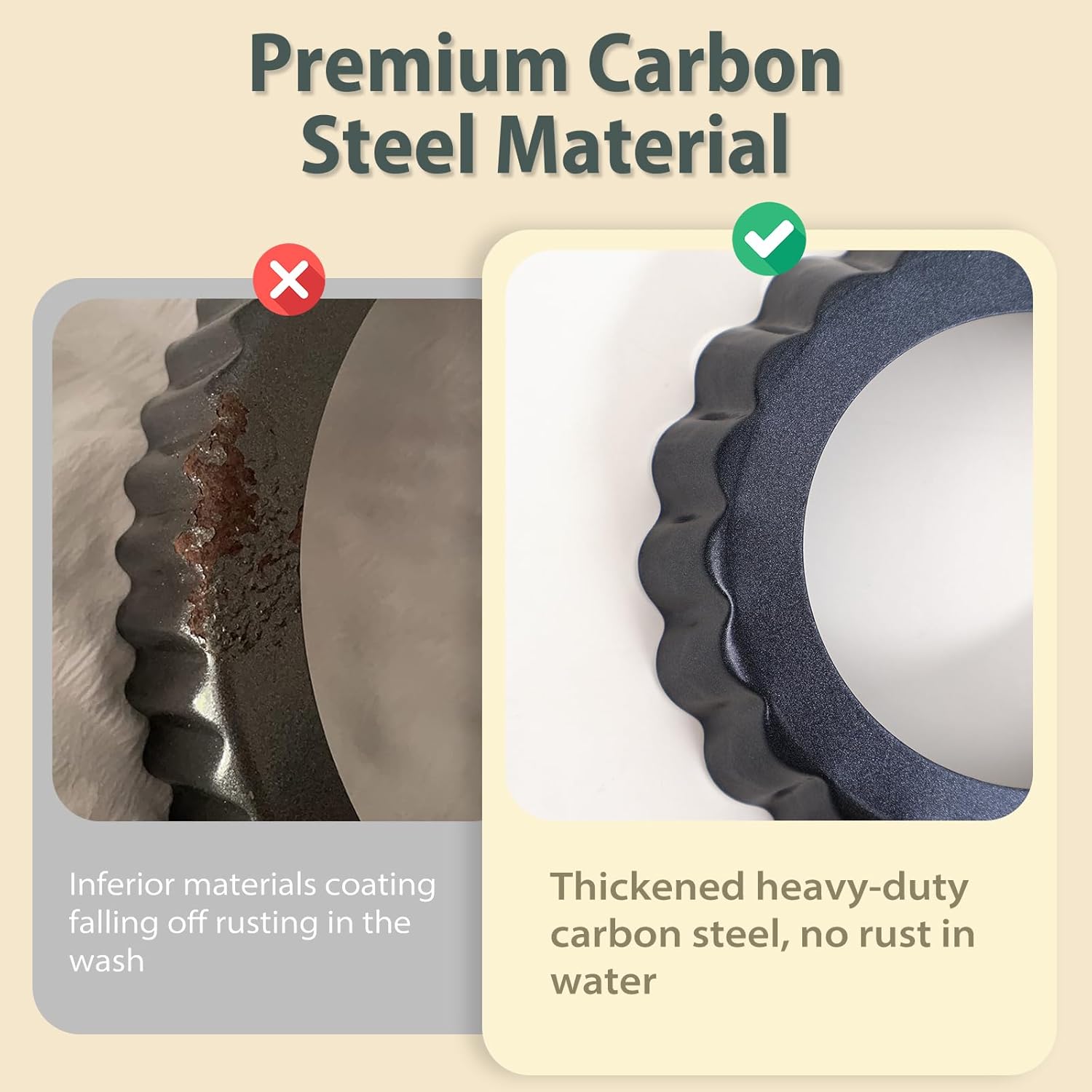- Heat Fast: Due to the thickened heavy-duty carbon steel material, the fruit tart mold has strong thermal conductivity, allowing heating up evenly with less oil, making it easier to use. Also provides additional cooling and good baking effect.